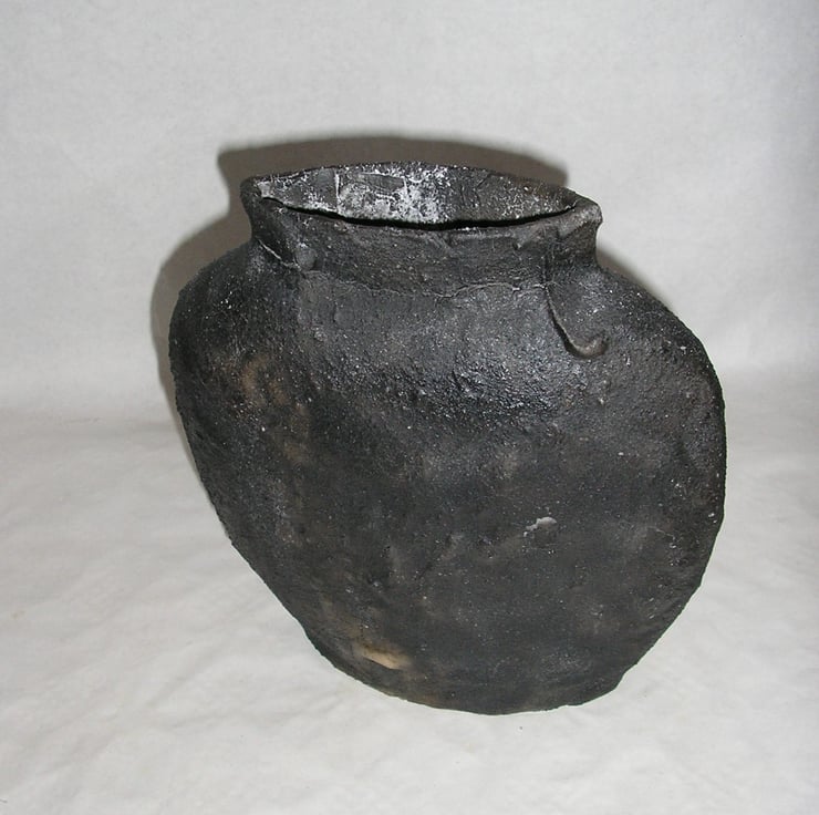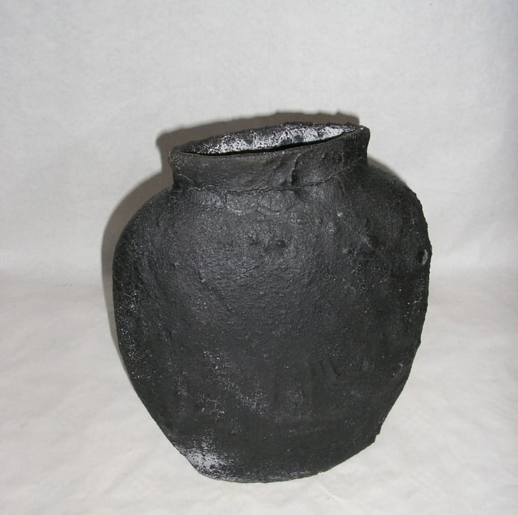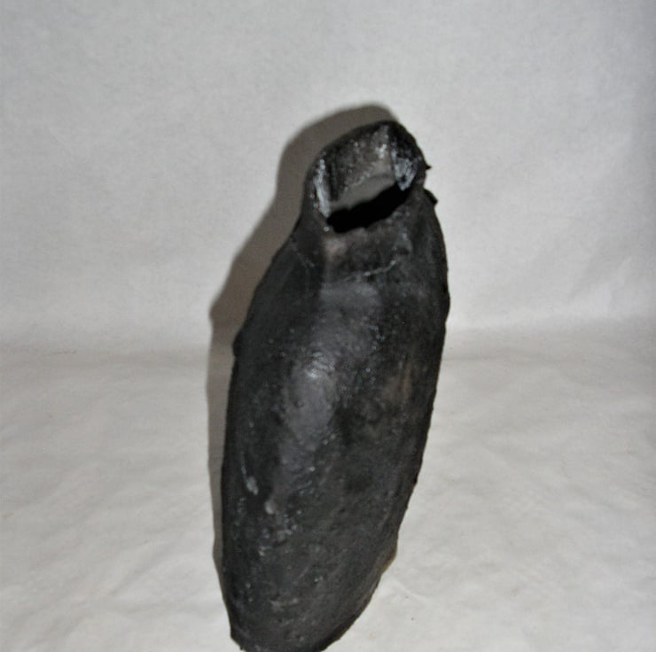 CRUMBLE GLAZE IS ROUGH AND CRATERED. THE INSIDE OF THE VASE IS RAW BLACK THE OUTSIDE OF THE VASE IS A CRATERED BLACK CRUMBLE GLAZE. IT WILL NOT HOLD WATER BUT COULD BE USED FOR DRIED FLOWER DISPLAY.