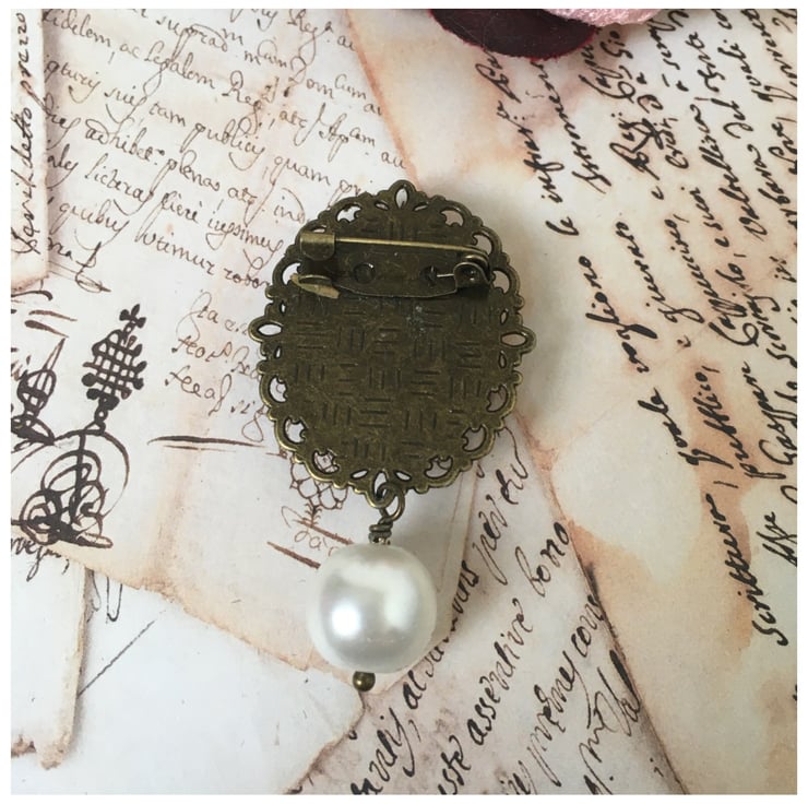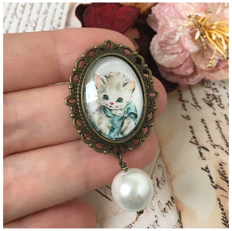 A retro inspired cat brooch featuring a super cute cat with a blue bow. This brooch has a glass pearl drop.