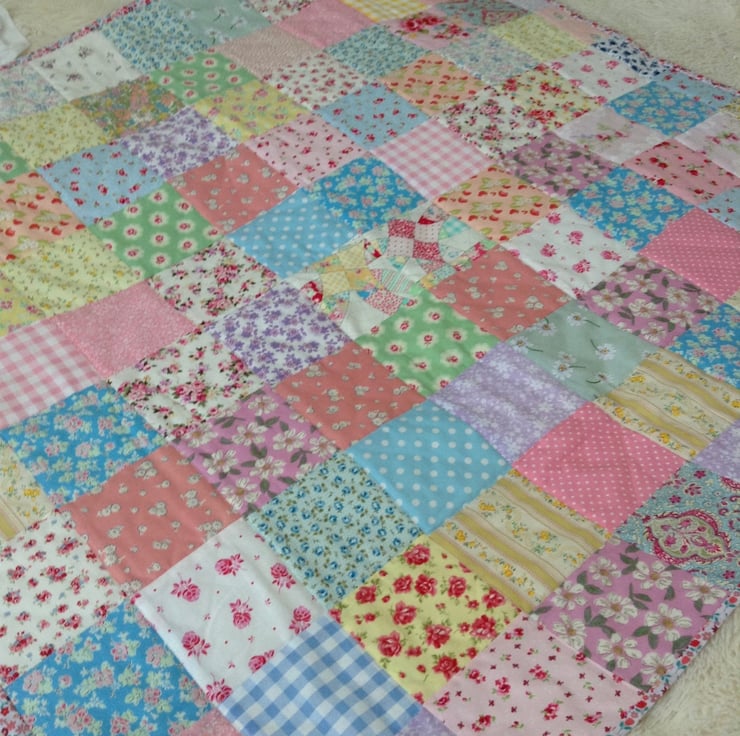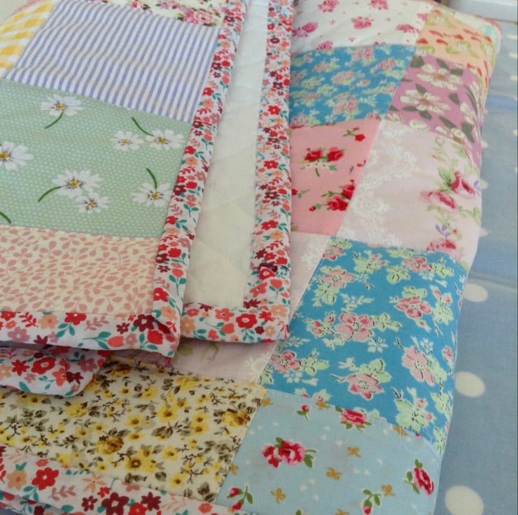 Gorgeous patchwork quilt made with various gorgeous fabrics with a ditsy floral cotton fabric trim and white cotton back ,It measures 110 cm x 126 cm and has been quilted