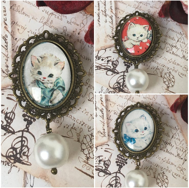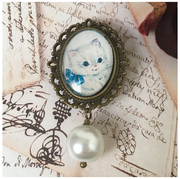 A retro inspired cat brooch featuring a super cute white cat with a blue bow. This brooch has a glass pearl drop giving it a real vintage look and feel.