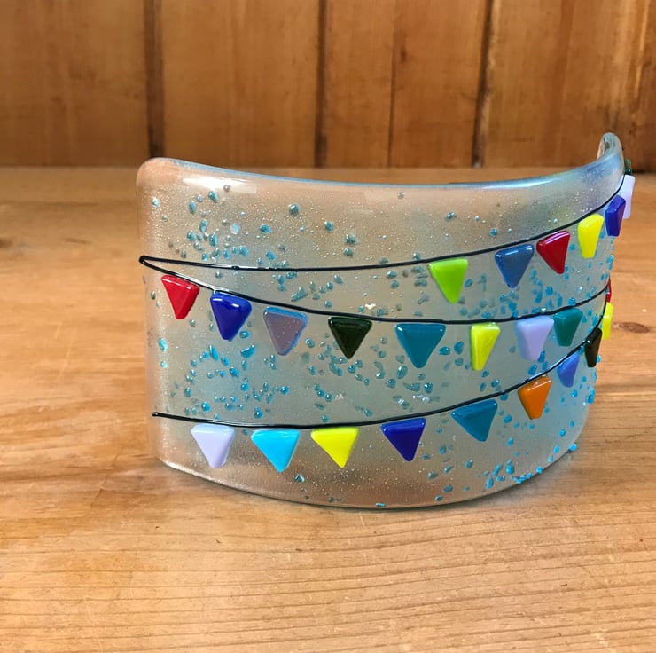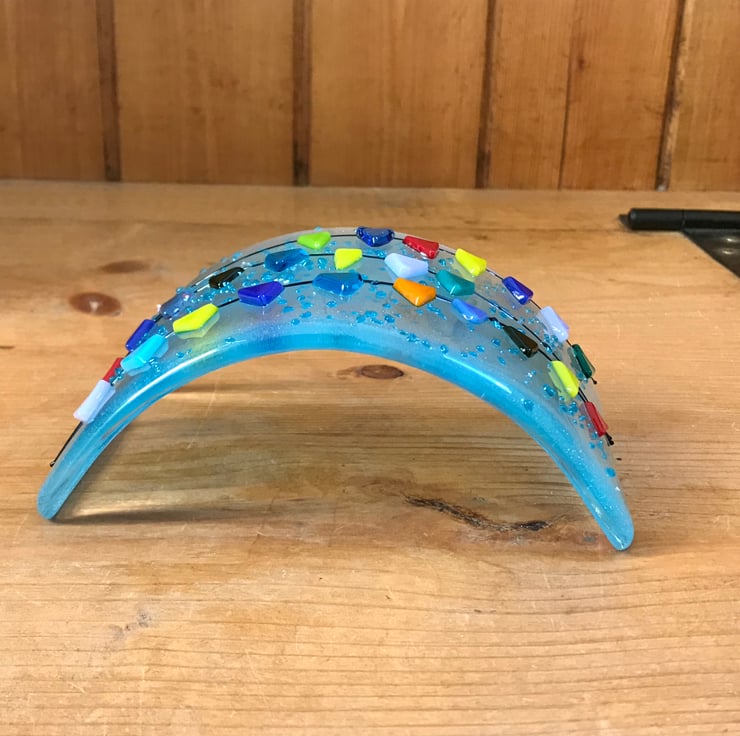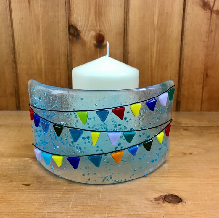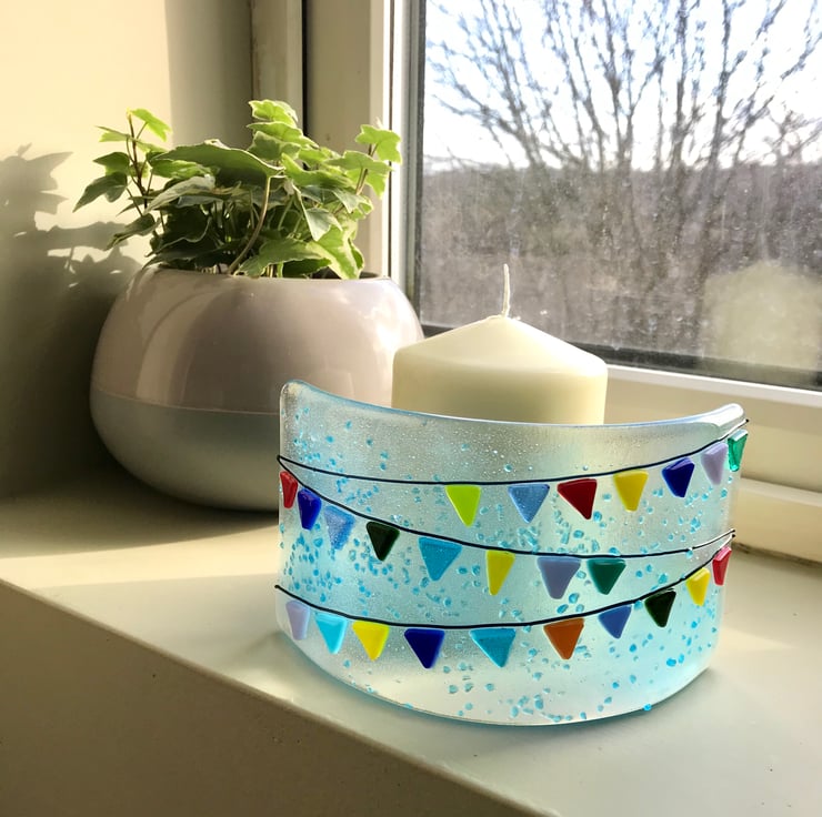 This colourful fused glass free standing curve is handmade by me in my Yorkshire studio. It features strings of bunting hanging in the air. Was 19.99 now 14.99.