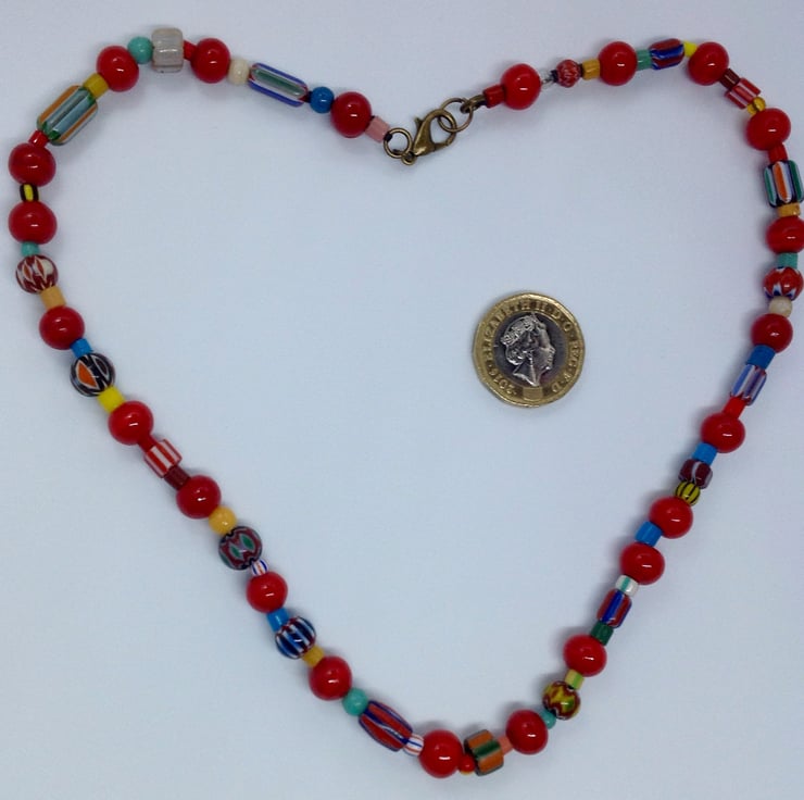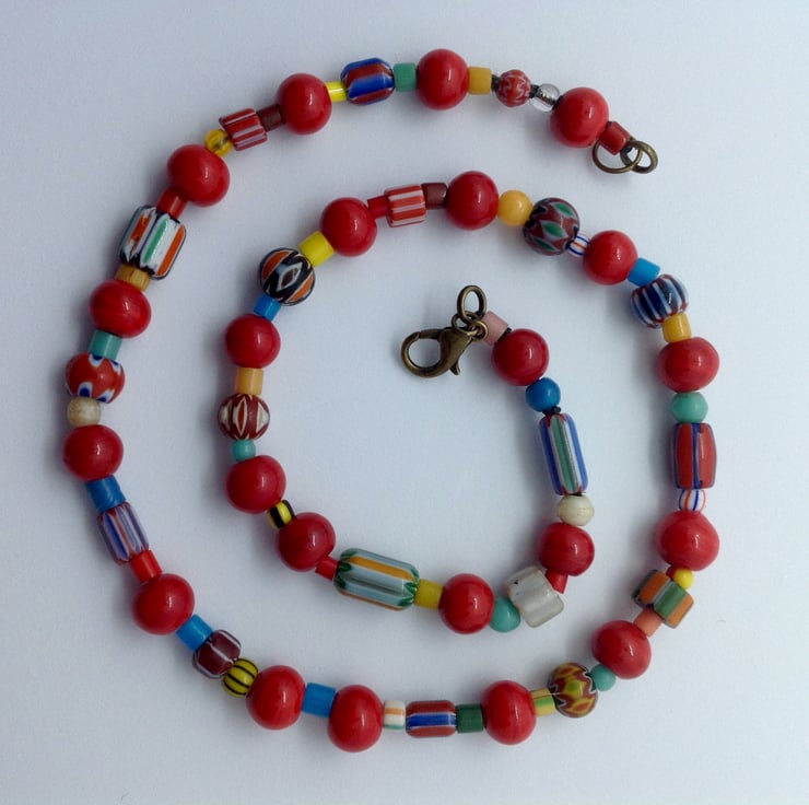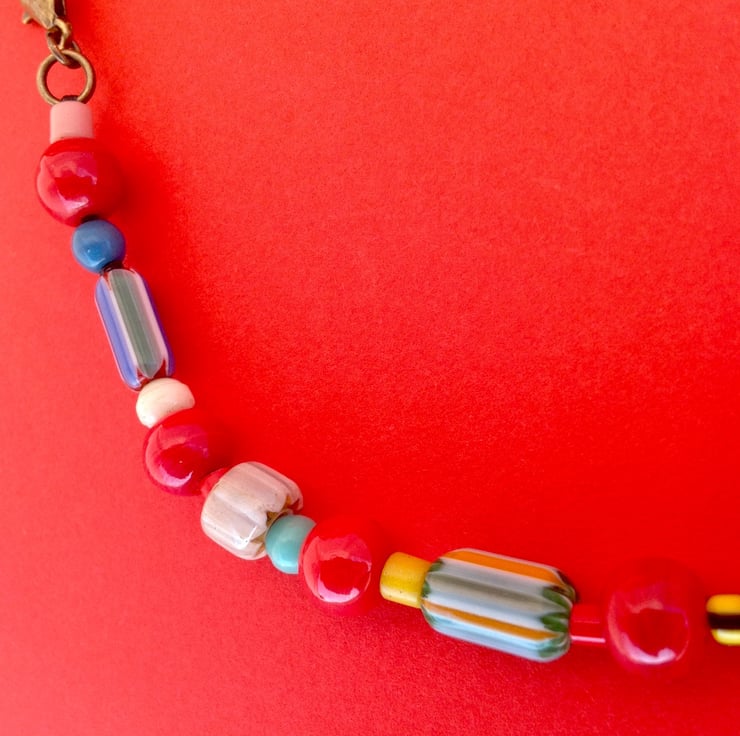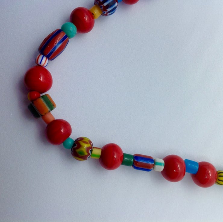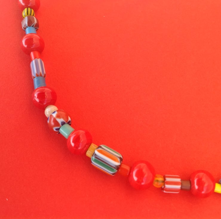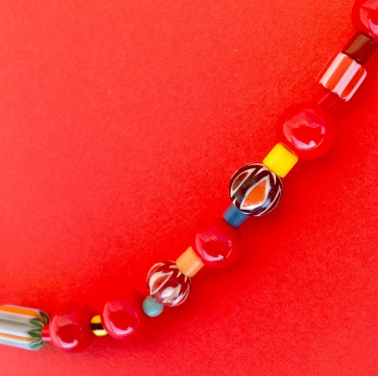 The main colour is red, and there are also small multicoloured beads from Africa and chevron trade beads from the Himalayas.