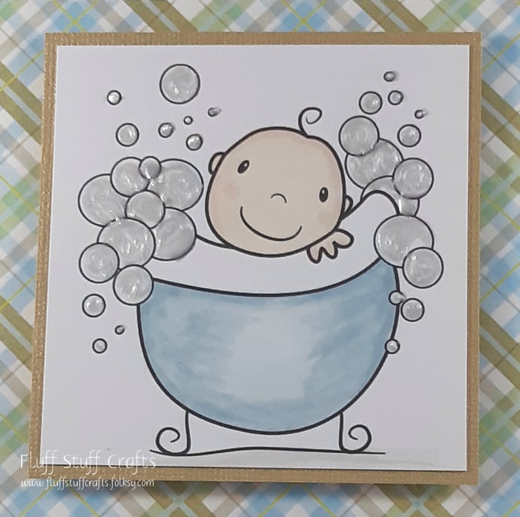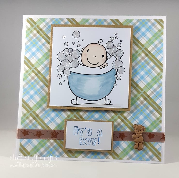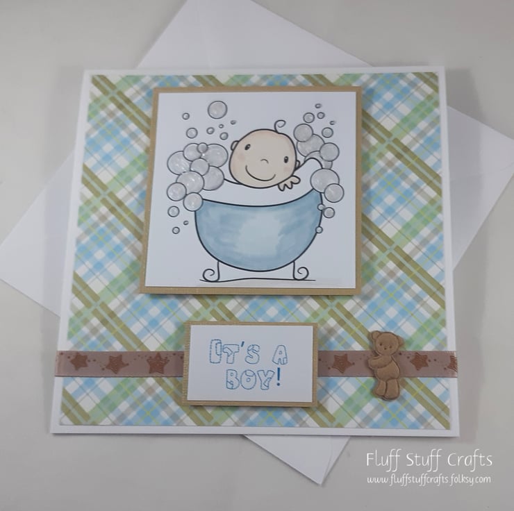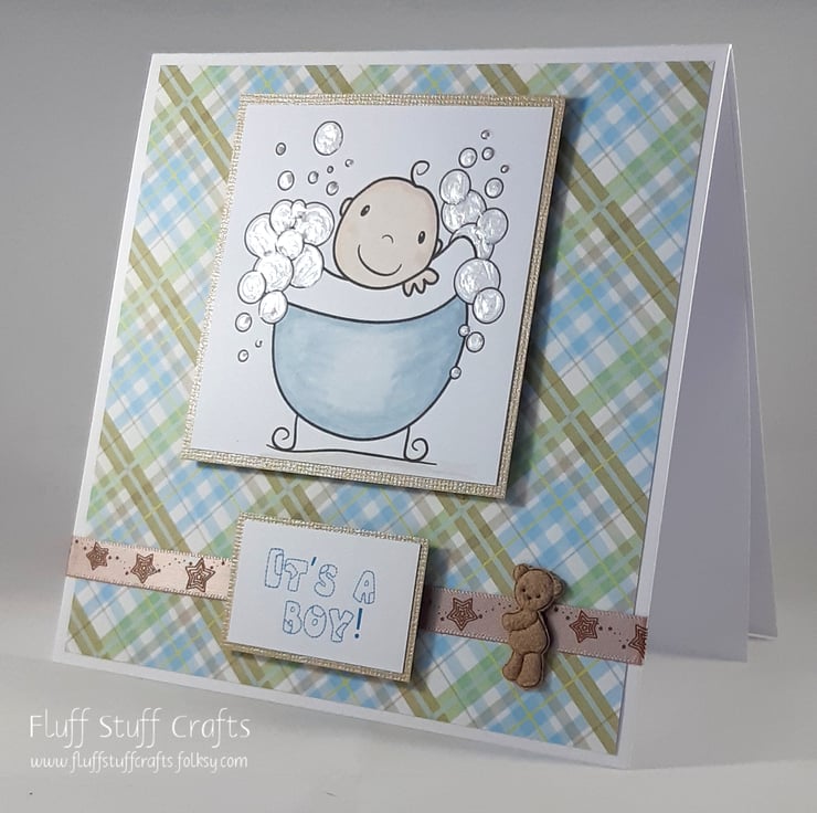 Square, tent folded new baby boy card, featuring a cute image of a baby in a bathtub surrounded by bubbles. The bubbles have been given texture using 3D pearls liquid. The image and the sentiment 'It's a boy!' have been mounted onto coffee coloured card over a blue, green and brown checked background. The card is embellished with star patterned satin ribbon and a small teddy bear.