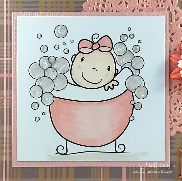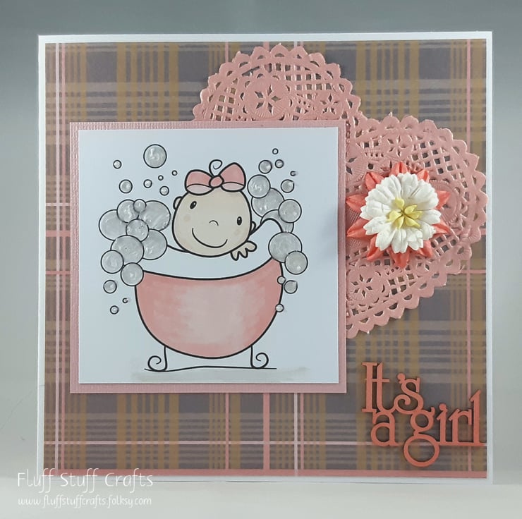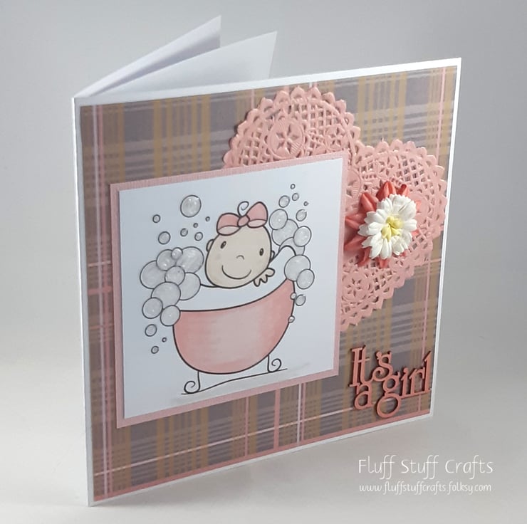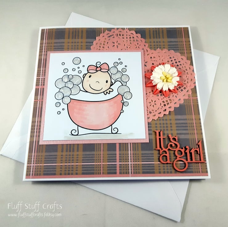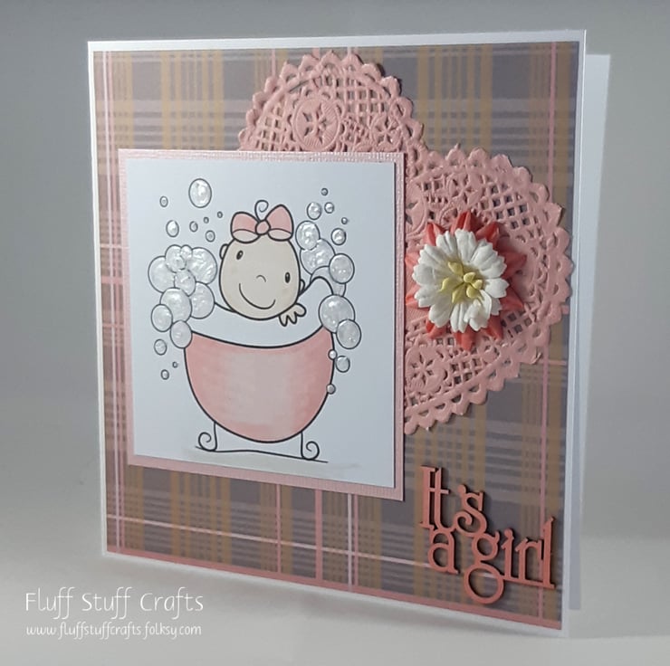Square new baby girl card, featuring a cute image of a baby in a bathtub surrounded by bubbles. The bubbles have been given texture using 3D pearls liquid. The image has been mounted onto pink textured card over a pink and grey checked background. The card is embellished with a pink doily heart and paper flowers. The sentiment 'It's a girl' is made from thick, laser-cut card and coloured to match.
