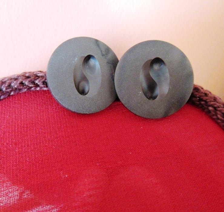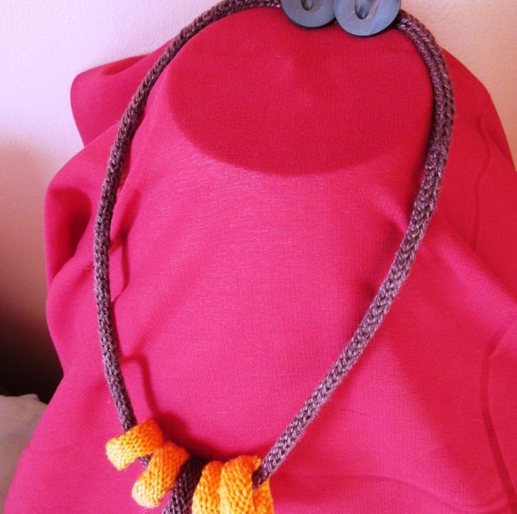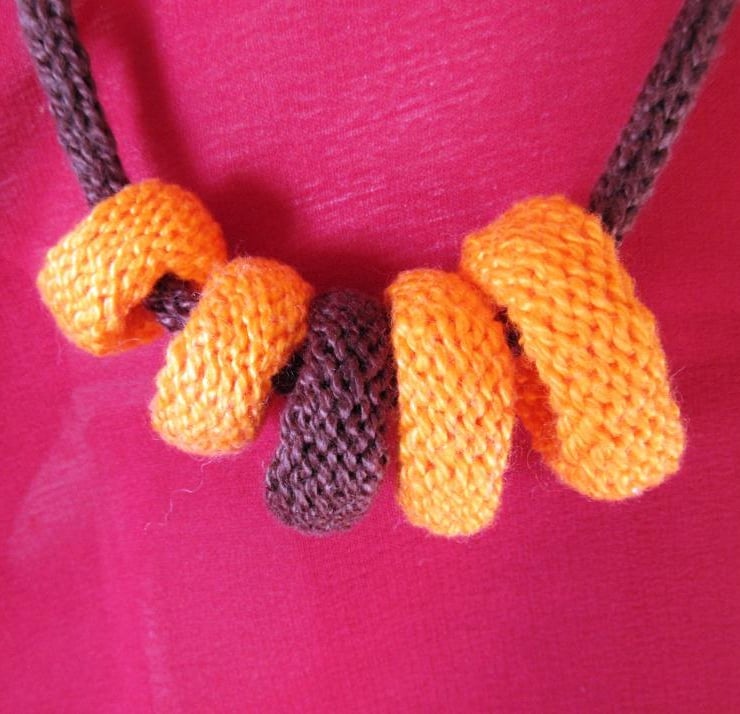 A necklace consistiing of five knitted rings in orange and brown crochet cotton, threaded on a cord of French knitting in dark brown crochet cotton with a button and loop fastening. The brown crochet cotton is Twilley's Stalite no 3 in shade 'Chocolate', the orange is shade 'Hot Orange'.
