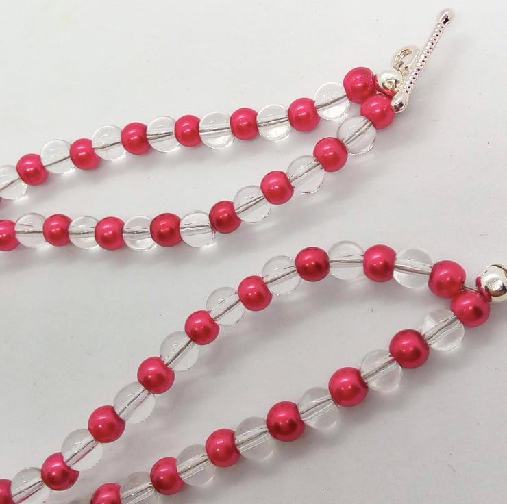 Stunning 4 mm red pearl beads and 4 mm clear round glass bead 2 strand bracelet with a silver plated cross centre with red crystals inset in the centre. It measures 7.5 inches in total and will comfortably fit a wrist 6.5 - 7.5 inches.