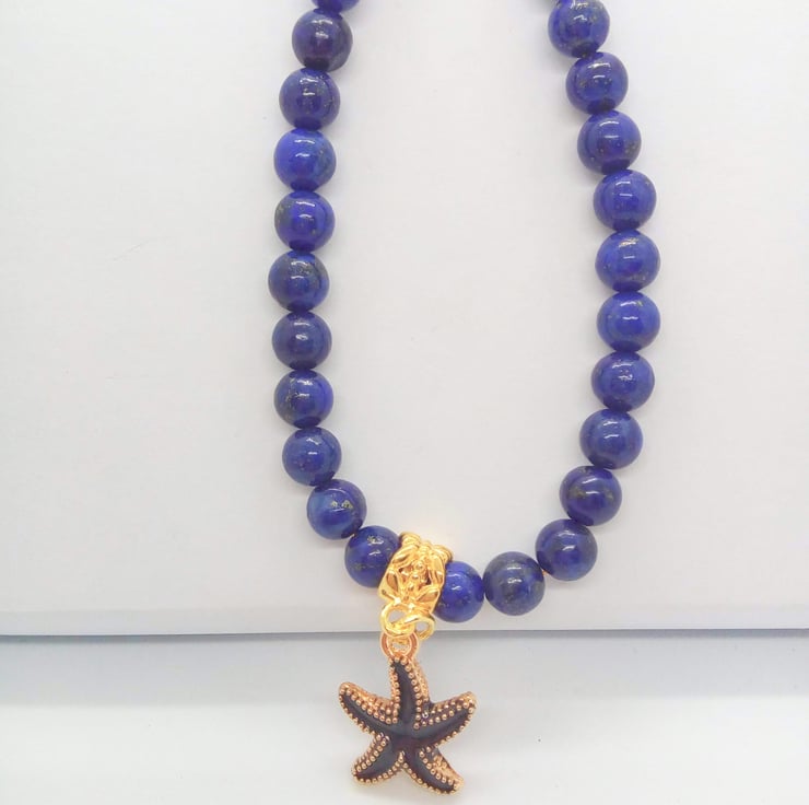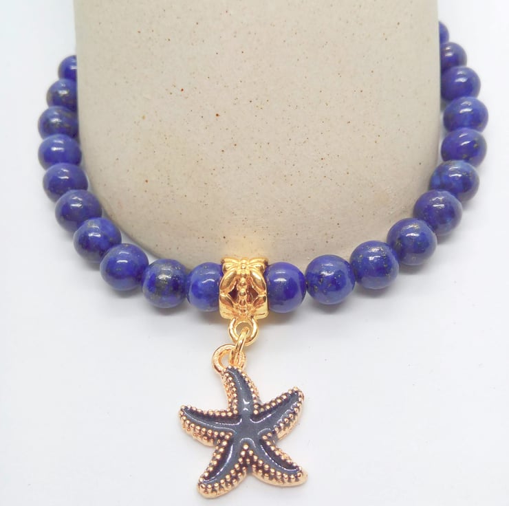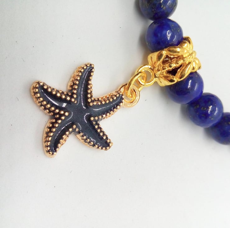 Lapis Lazuli Beaded Bracelet With A Gold Plated Enamelled Charm, Mother's Day Gift, Birthday Gift, Anniversary Gift, Valentine's Gift