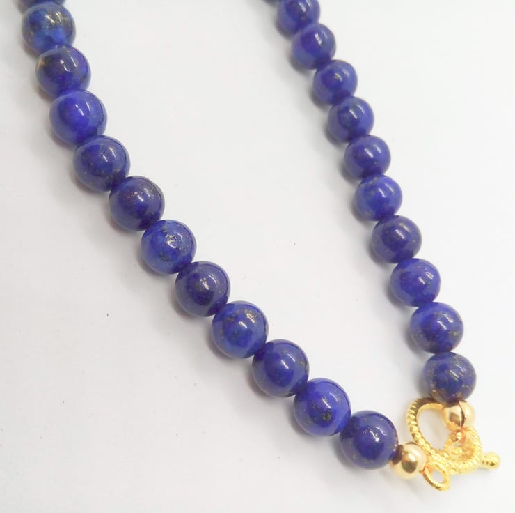 Very pretty bracelet made using 6mm lapis lazuli semi precious round beads with gold plated bail and clasp and a 15mm x 15mm gold plated enamelled blue charm. It is fastened with a gold plated toggle clasp.