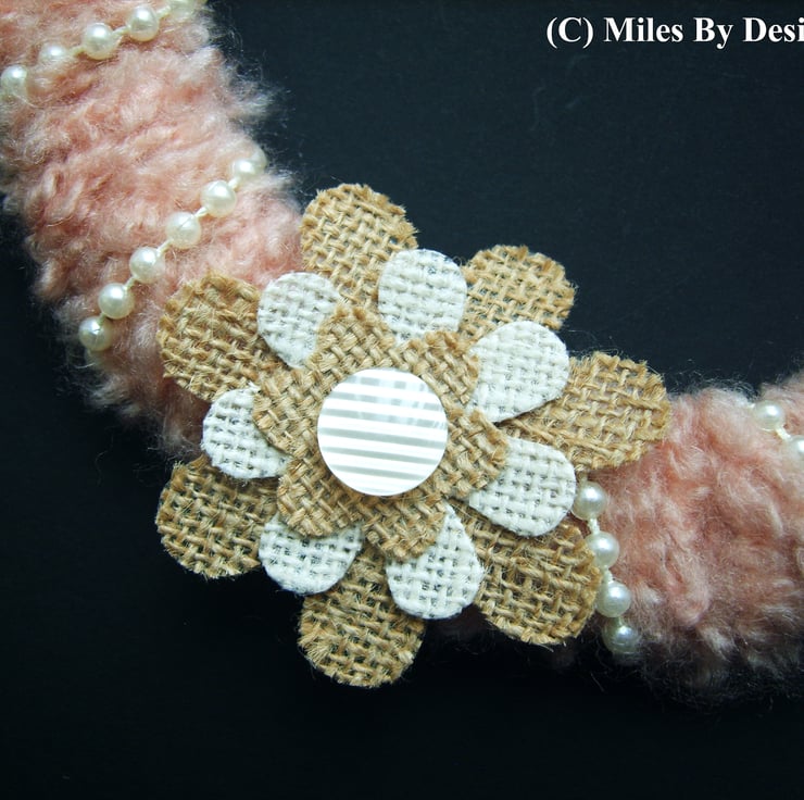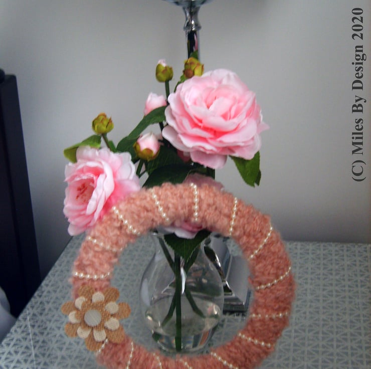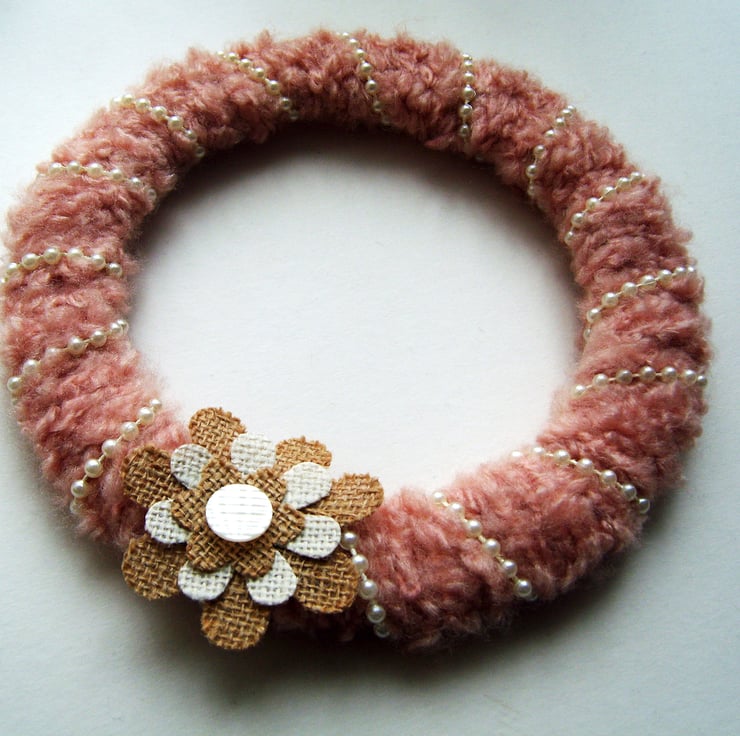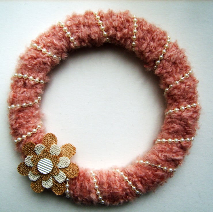 Its metal frame has been over wrapped with a blush pink poodle wool, which has then had plastic pearl beads wrapped around and securely sewn on.