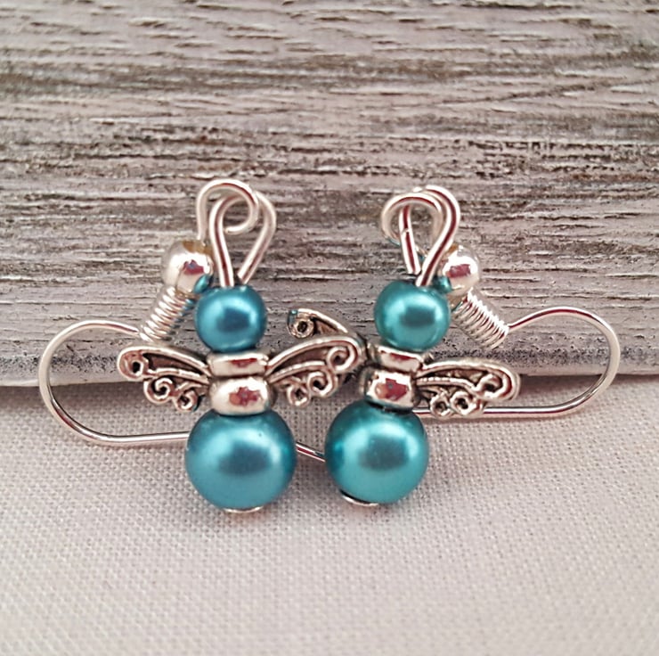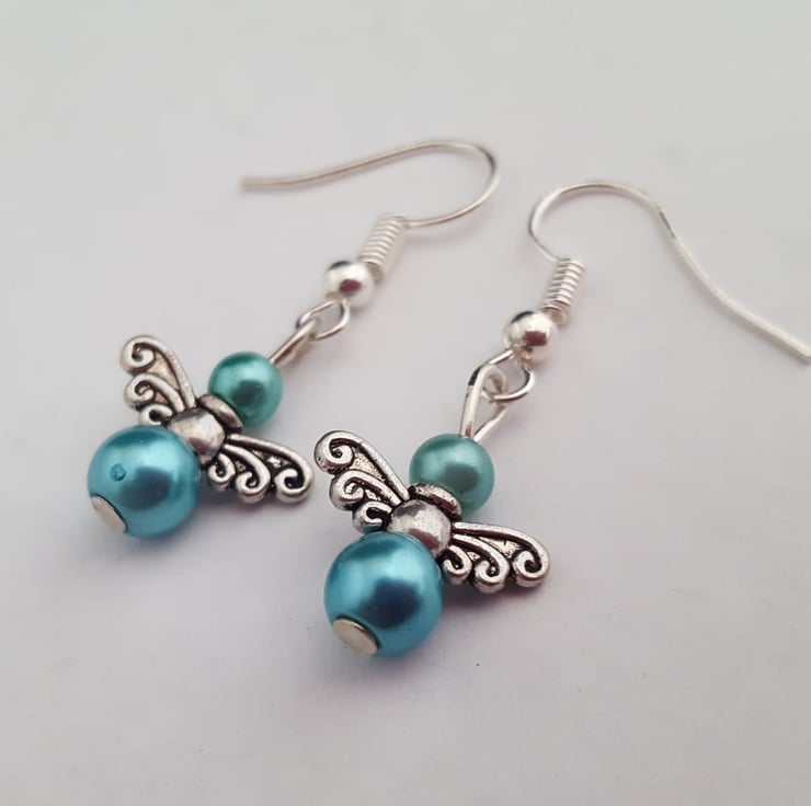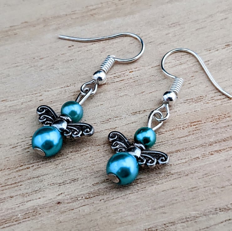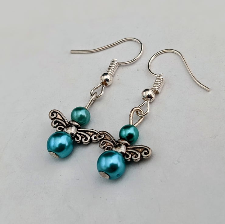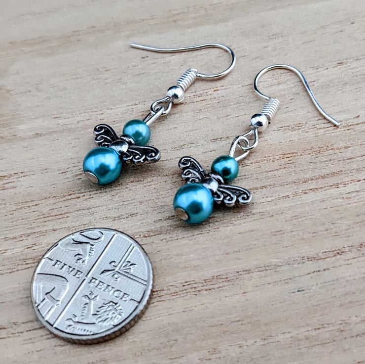 Tiny dainty angel earrings - 6mm and 4mm turquoise glass pearls with Tibetan silver wings, on hypo allergenic silver plated hooks. 15mm long excluding hooks. In an organza gift bag.