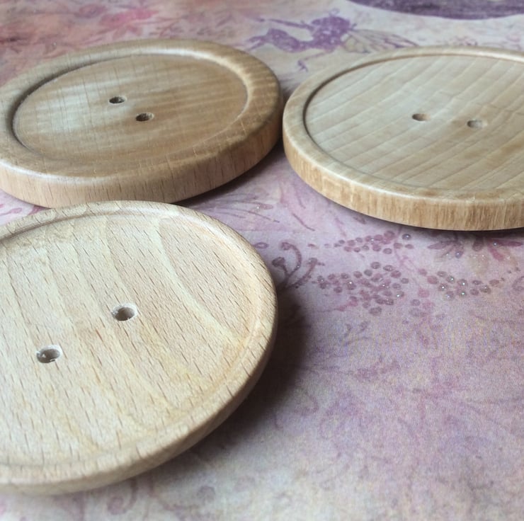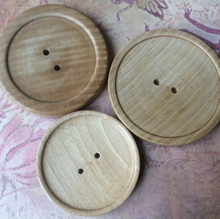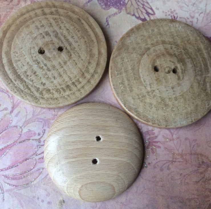 Three ash wood buttons, hand turned by my husband.