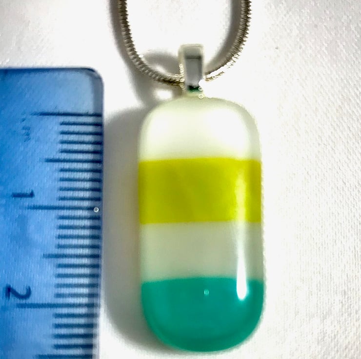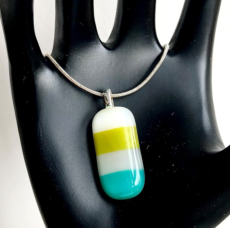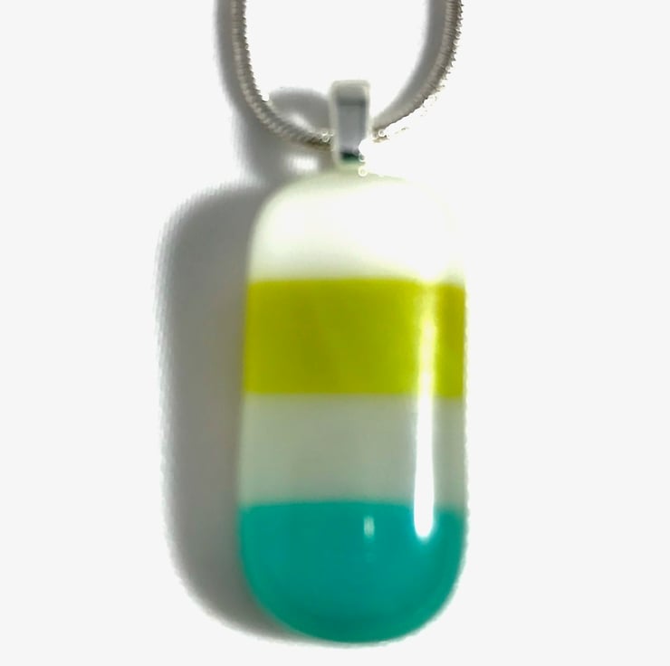 A vibrant coloured pendant made from 5 pieces of glass fused together at 800 degrees Celsius. A silver plated bail has been attached and is hung on a 16” silver plated chain. Comes with a gift box.