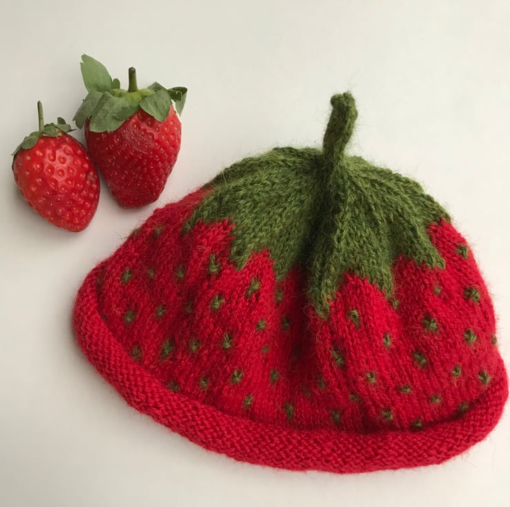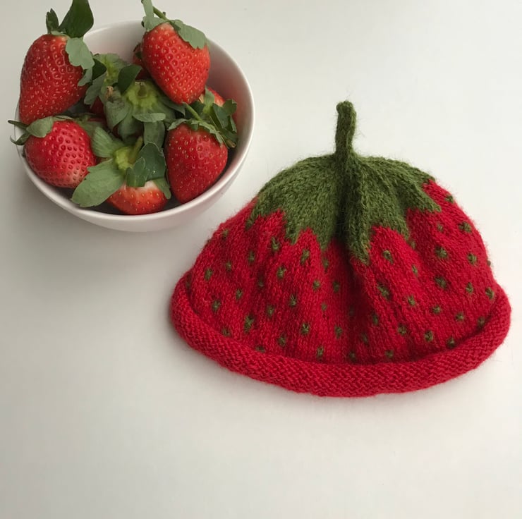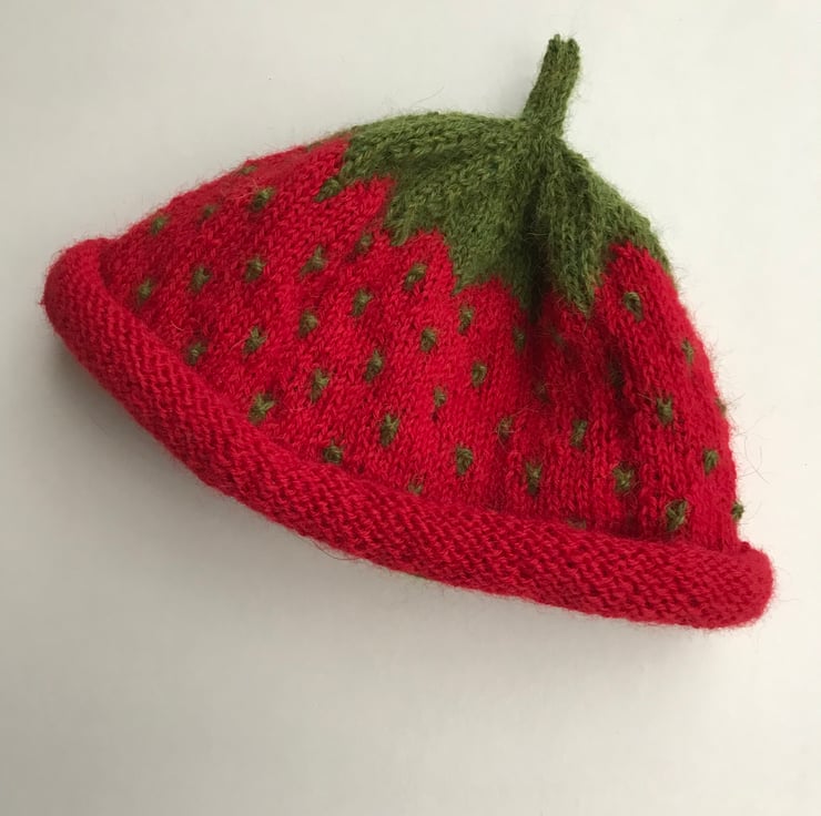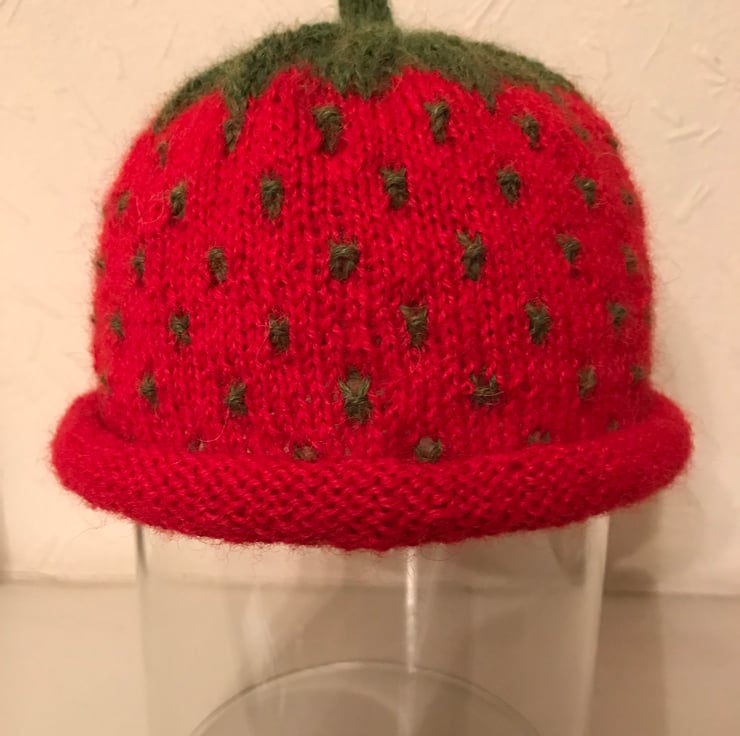 This cute little strawberry baby hat is hand knitted in a luxurious Alpaca wool. Worked in bright red it has a rolled brim, is patterned with green 'seeds' all over and has a green leaf and stalk at the top.