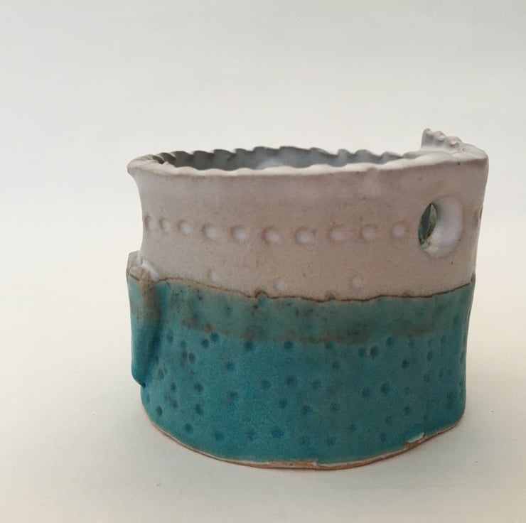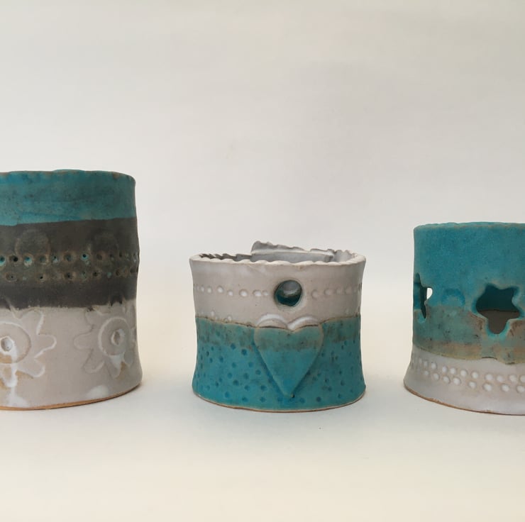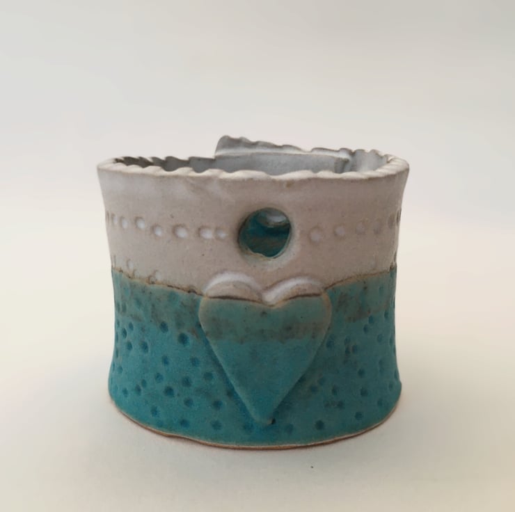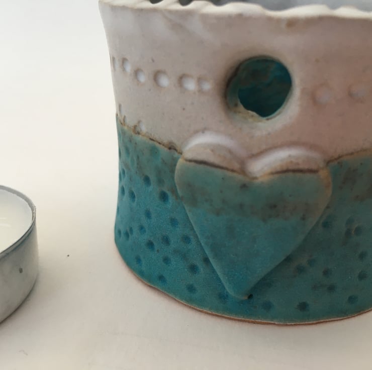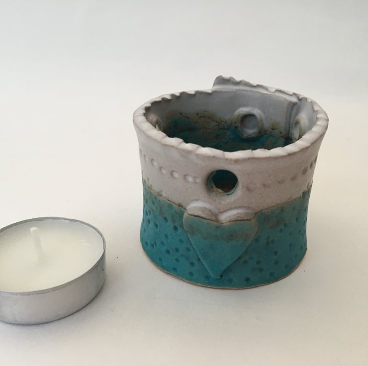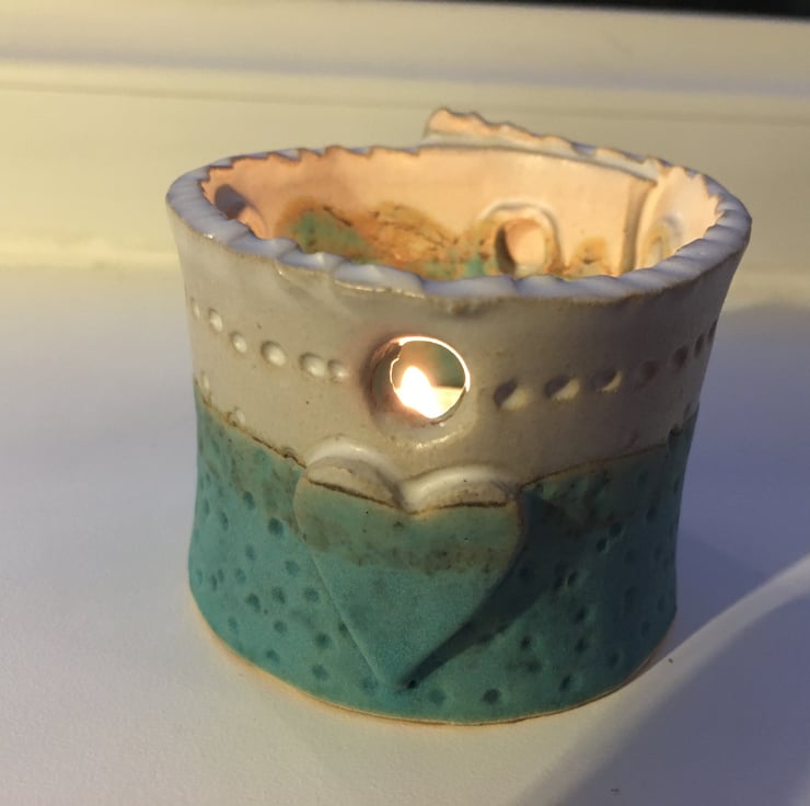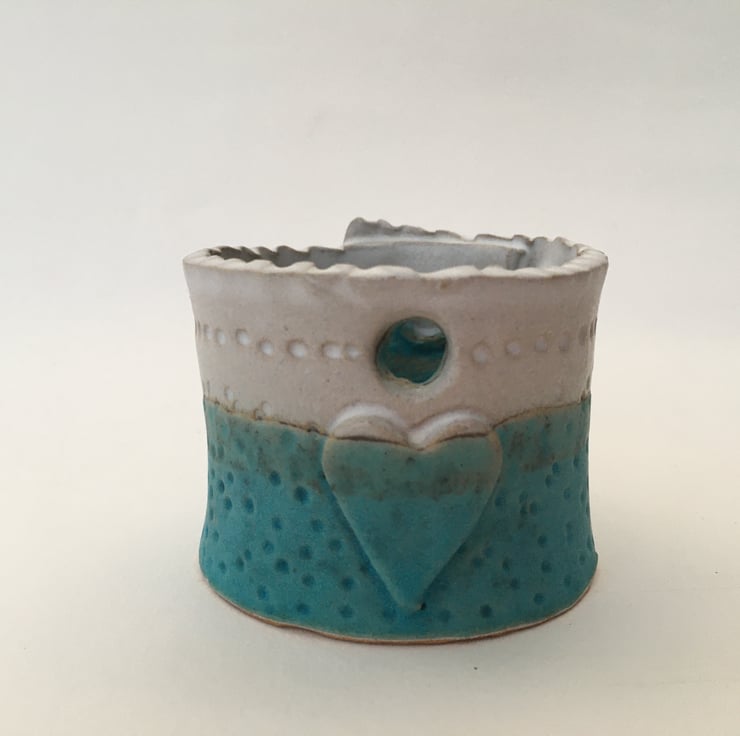 This beautiful tea light holder is made using stoneware clay and glazed using two of my secret recipe glazes. It has little holes cut out around the design for the light from your tealight to shine through. It has a loveheart pressed onto the design of the tea light.