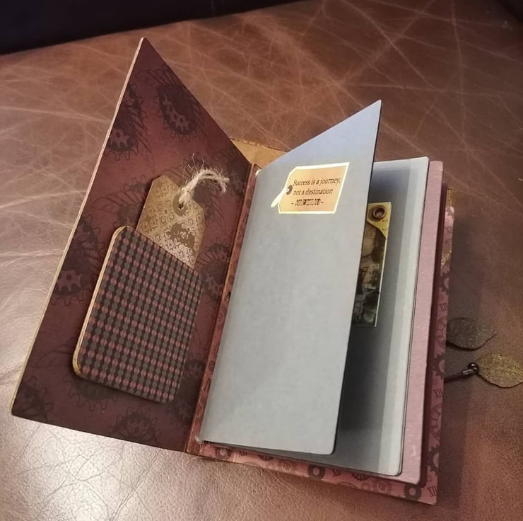 Inside there is a small lined notebook ,2 pockets containing tags for journalling and extra card pages with space for notes and photographs.