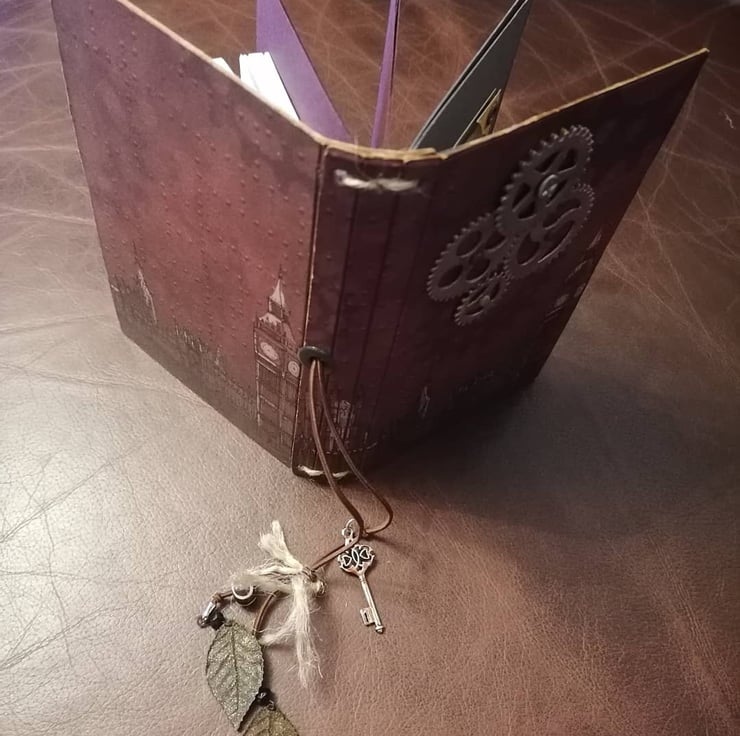 The cover is made from greyboard covered with decorative paper featuring the Houses of Parliament and Big Ben. I have added some cogs made from recycled card and metal brads.