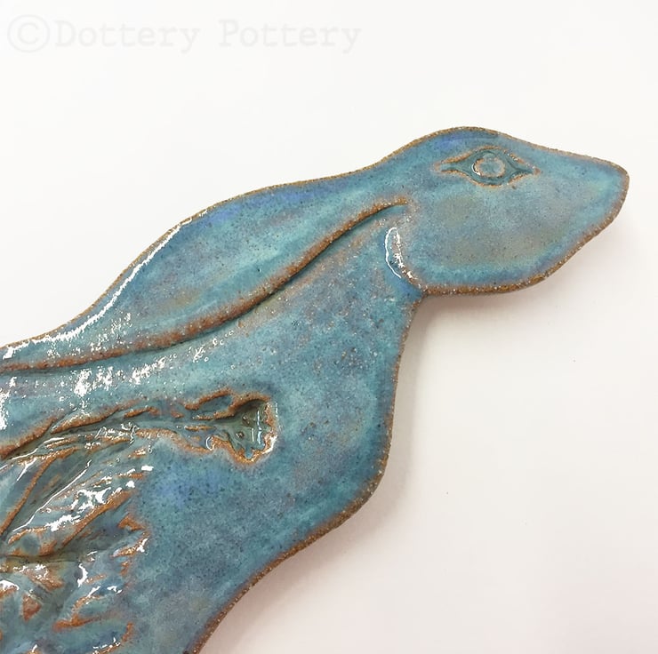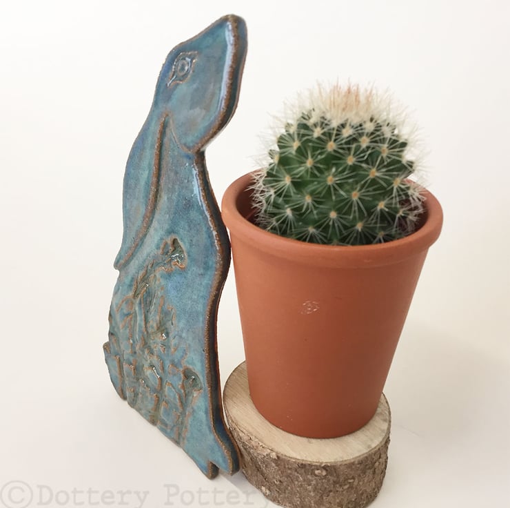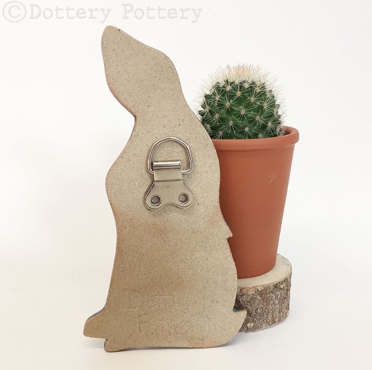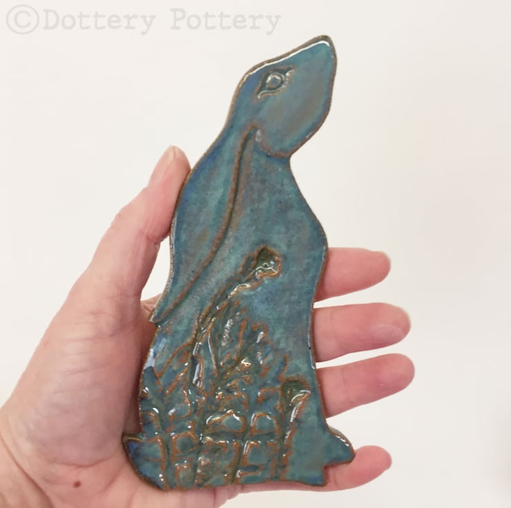 This delightful moon gazing hare is made from textured stoneware clay and decorated with pattern. It is cut from a hand drawn template. It is then fired once and decorated with stoneware glazes and re-fired to 1260 degrees making it nice and strong. It has a metal D ring hanging loop attached to back so that you can either hang it straight on the wall or tie a loop of ribbon/ string to it. Hare dimensions are 15 x 9cm x 0.6cm deep