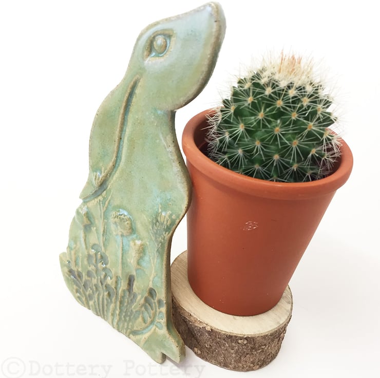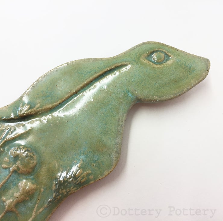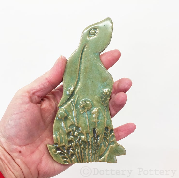 This delightful moon gazing hare is made from textured stoneware clay and decorated with pattern. It is cut from a hand drawn template. It is then fired once and decorated with stoneware glazes and re-fired to 1260 degrees making it nice and strong. It has a metal D ring hanging loop attached to back so that you can either hang it straight on the wall or tie a loop of ribbon/ string to it. Hare dimensions are 15 x 9cm x 0.6cm deep