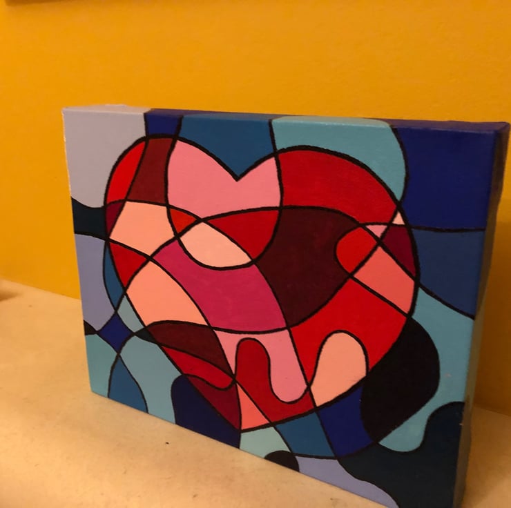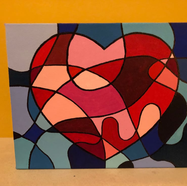 Reds, pinks and blues acrylic painted abstract heart deep canvas.