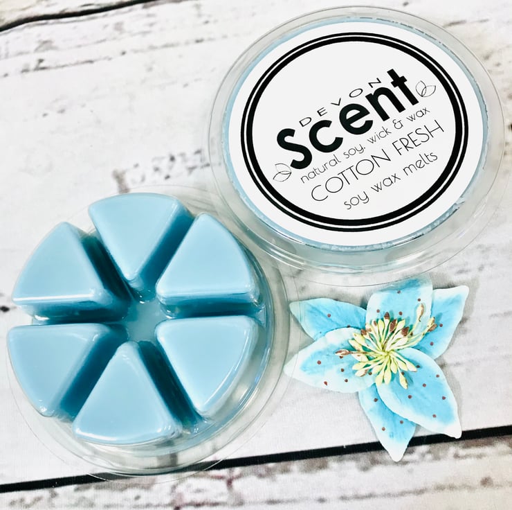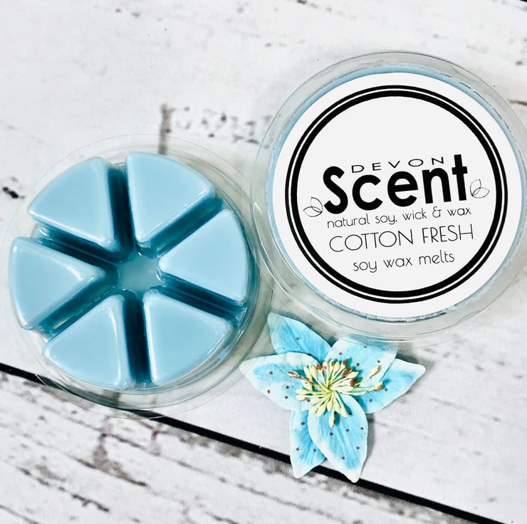 Our 6 segment circular recyclable pot of Cotton Fresh Wax Melts is similar in fragrance to a popular fabric conditioner.