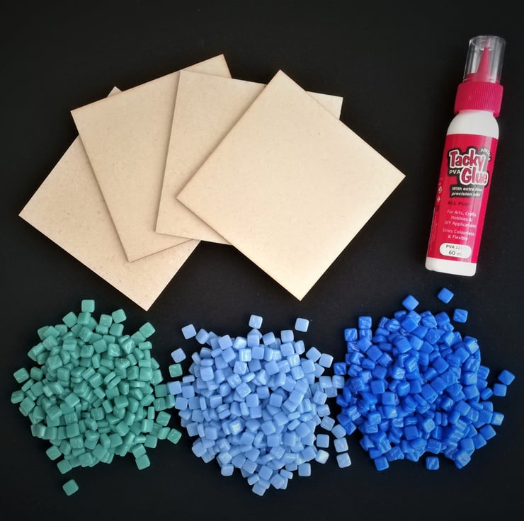 These mosaic kits contain all the materials you need to make four 10.6 cm square coasters that have been carefully designed so that they can be used separately or placed together to form one large 21.2cm square making a perfect centre piece on any table. Fancy a change? Have fun moving around the coasters to vary the pattern. These kits make an ideal mosaic craft project for yourself or can be given as a gift. You could also combine these two, make up the coasters yourself and give them as a present for someone special. Mosaic Kit Contents: Glass tiles 8mm: Due to the way in which these recycled tiles are manufactured, some of the tiles may vary slightly in size. Therefore, extra tiles have been included in this kit. This kit follows a pixelated design so that the tiles fit together without messy cutting or grouting. 4 MDF boards measuring 10.6cm by 10.6cm to use separately or place together to make one large design. Tacky Glue (60ml) with a precision nozzle minimising mess. 16 clear doomed self-adhesive rubber feet to protect surfaces and minimise slipping. 1 Coaster Design to follow or design your own with the tiles provided. Making instructions. If you wish to paint the sides and base of your boards this can be done before or after mosaicing and before you place the feet on the corners of each board.