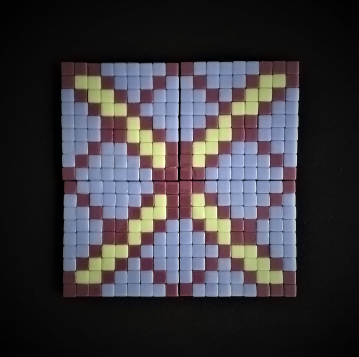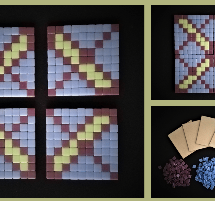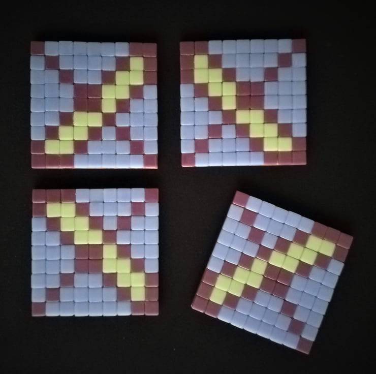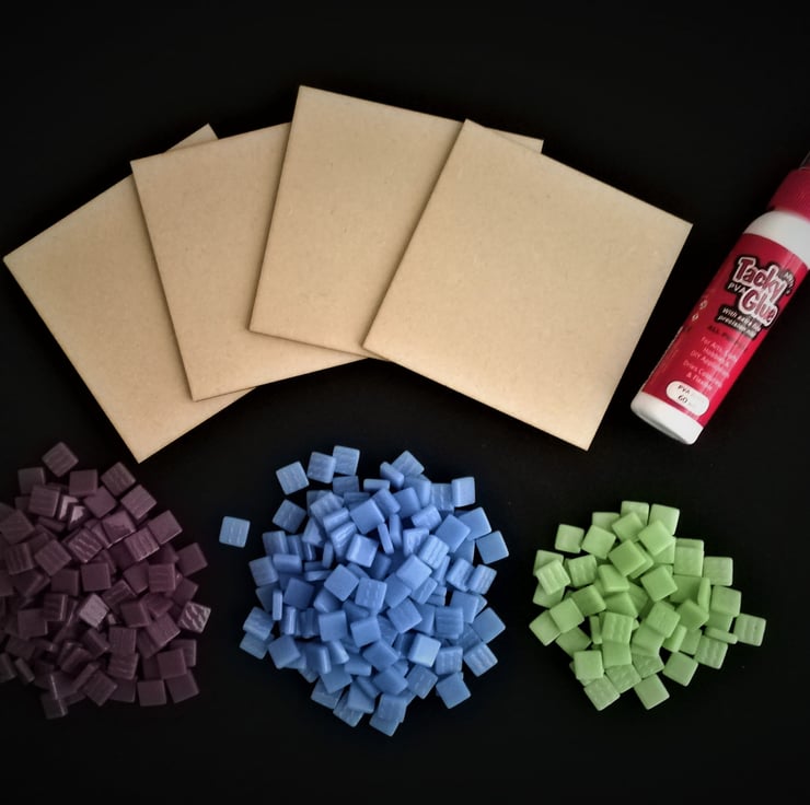These mosaic kits contain all the materials you need to make four 10.6 cm square coasters that have been carefully designed so that they can be used separately or placed together to form one large 21.2cm square making a perfect centre piece on any table. Fancy a change? Have fun moving around the coasters to vary the pattern. These kits make an ideal mosaic craft project for yourself or can be given as a gift. You could also combine these two, make up the coasters yourself and give them as a present for someone special. Mosaic Kit Contents: Glass tiles 12mm: Due to the way in which these recycled tiles are manufactured, some of the tiles may vary slightly in size. Therefore, extra tiles have been included in this kit. This kit follows a pixelated design so that the tiles fit together without messy cutting or grouting. 4 MDF boards measuring 10.6cm by 10.6cm to use separately or place together to make one large design. Tacky Glue (60ml) with a precision nozzle minimising mess. 16 clear doomed self-adhesive rubber feet to protect surfaces and minimise slipping. 1 Coaster Design to follow or design your own with the tiles provided. Making instructions. If you wish to paint the sides and base of your boards this can be done before or after mosaicing and before you place the feet on the corners of each board.