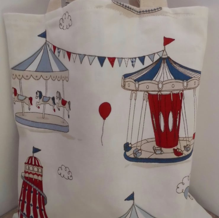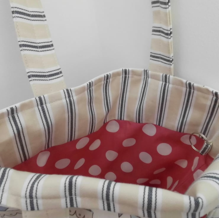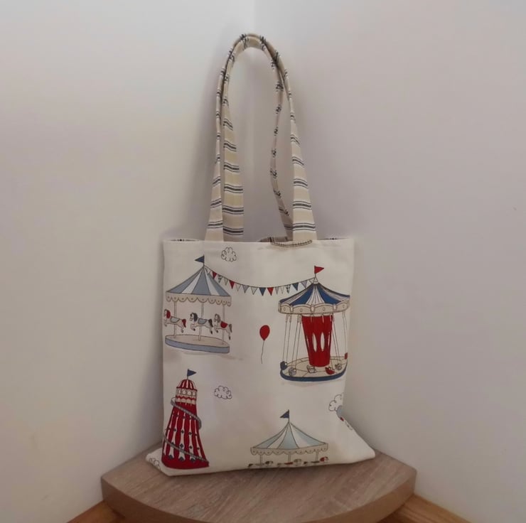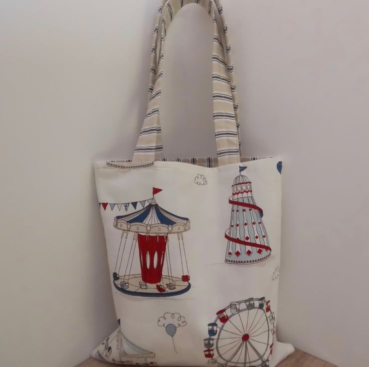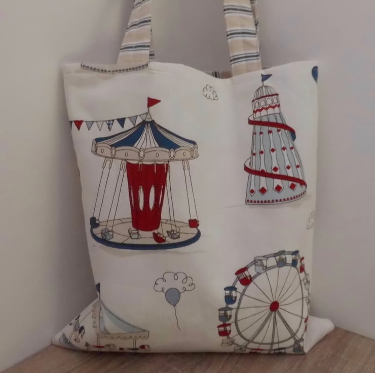 This tote bag has been made from a colourful cotton fabric depicting fairground rides. It is Faced at the top with a striped cotton for a professional finish and then lined with pink and white spot quilting cotton. I have inserted a key ring into one of the side seams, useful for clipping keys or purse safely inside your bag. The handles are made from the striped fabric and I have interlined them to make them more comfy.