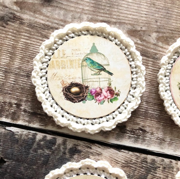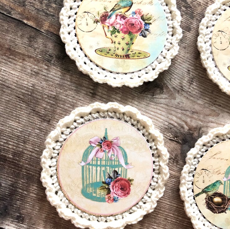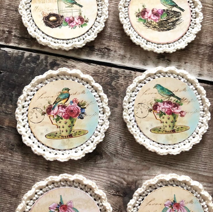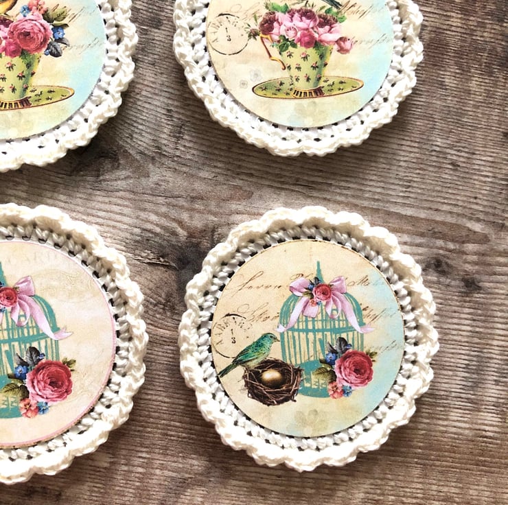 Set of 6 x Beautiful shabby chic style images. I have hand crocheted around each image.