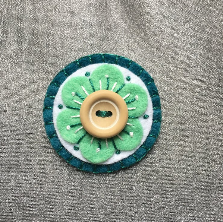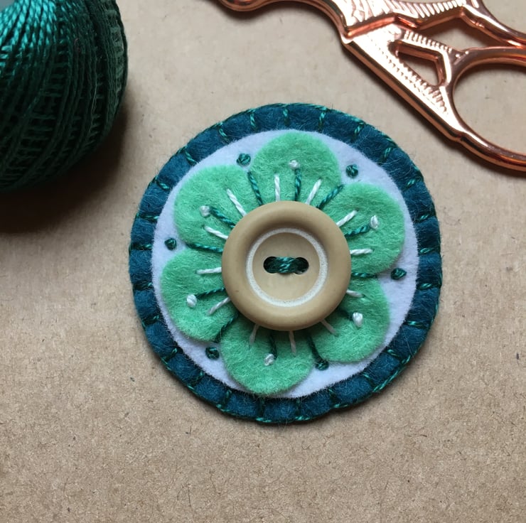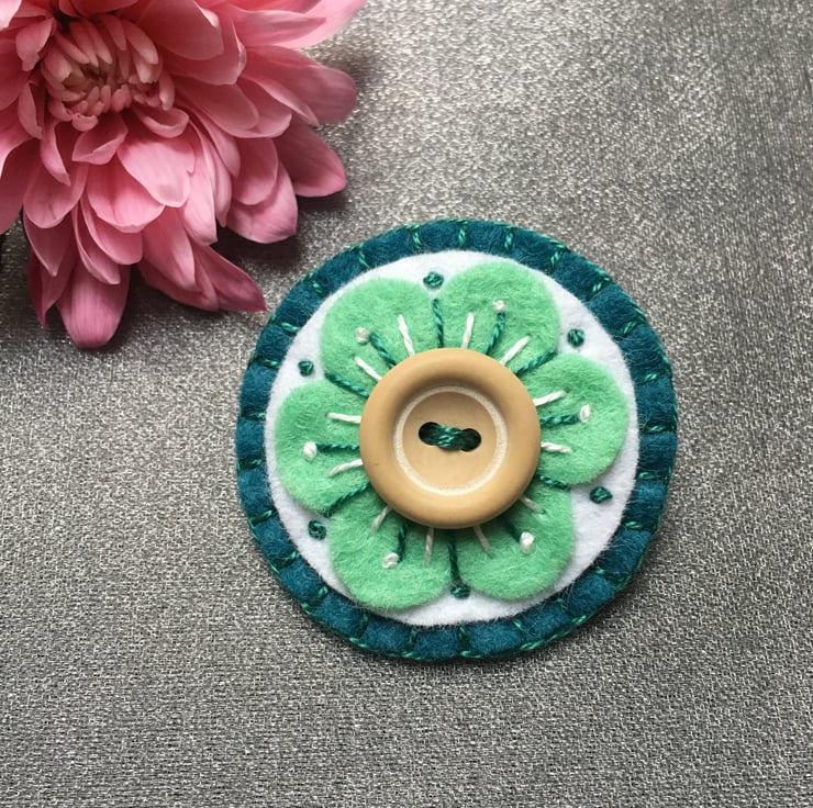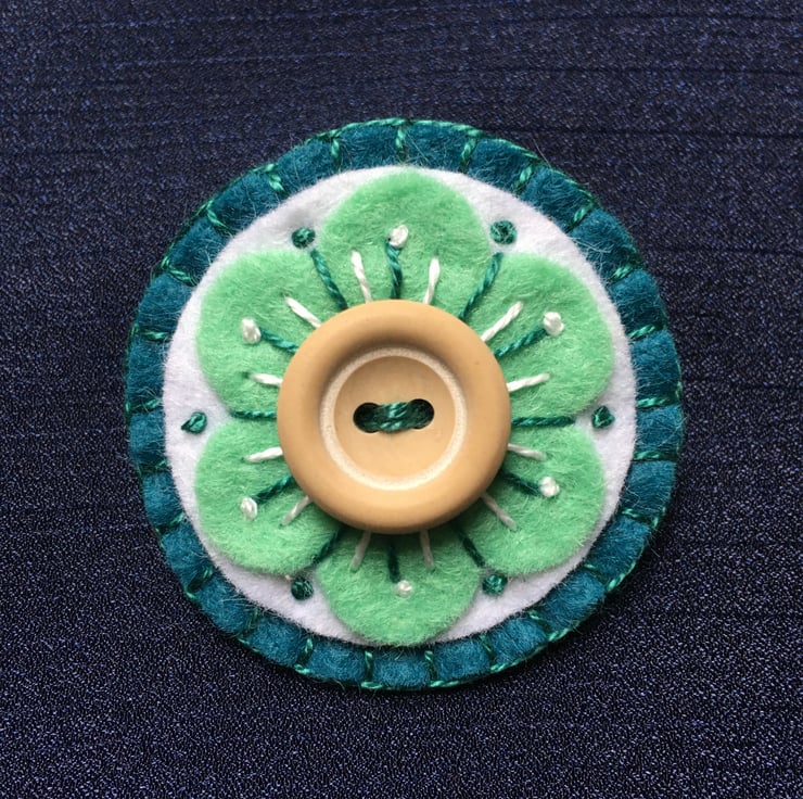 The brooch has been hand cut, stitched, and embroidered using complimentary felt and embroidery thread colours and finished with a button detail. It measures approximately 5cm in diameter.