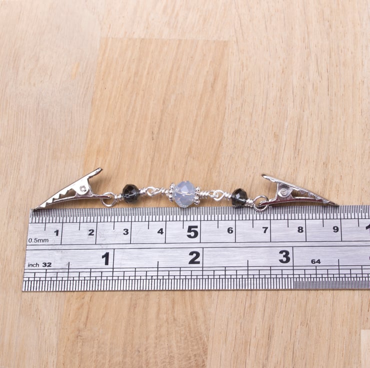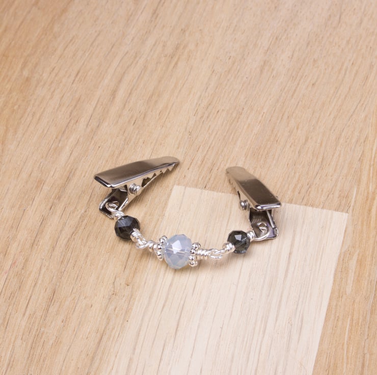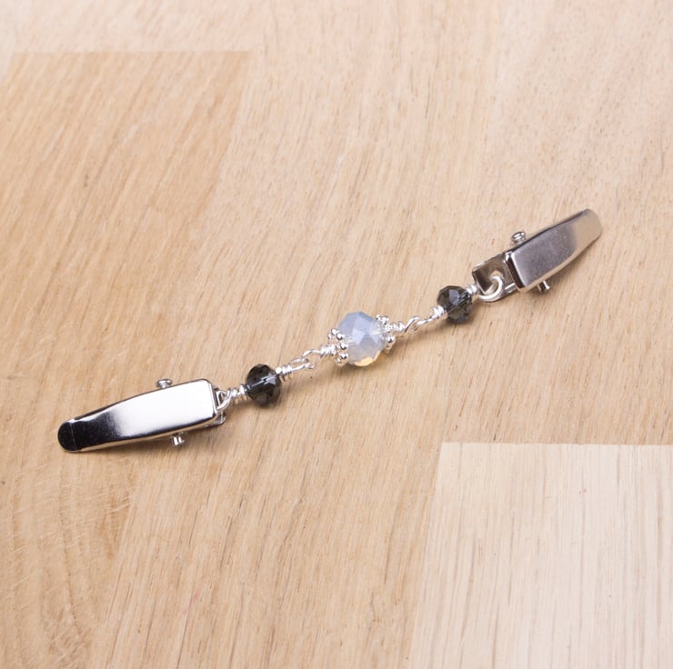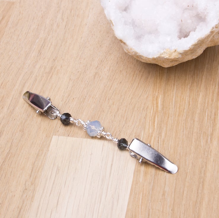 This handy clothing clip features opalite faceted glass with Tibetan silver accents and grey faceted glass beads which sit between silver-tone clips and is approximately 3.5 inches long (inc clips )