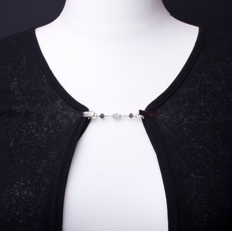 Such a useful little clip chain. It can be used to hold together a buttonless cardigan, shawl or pashmina. You could even use it at the back of a top that is too big to make it more fitted, or as an ID badge holder.