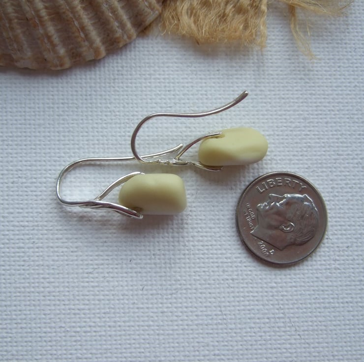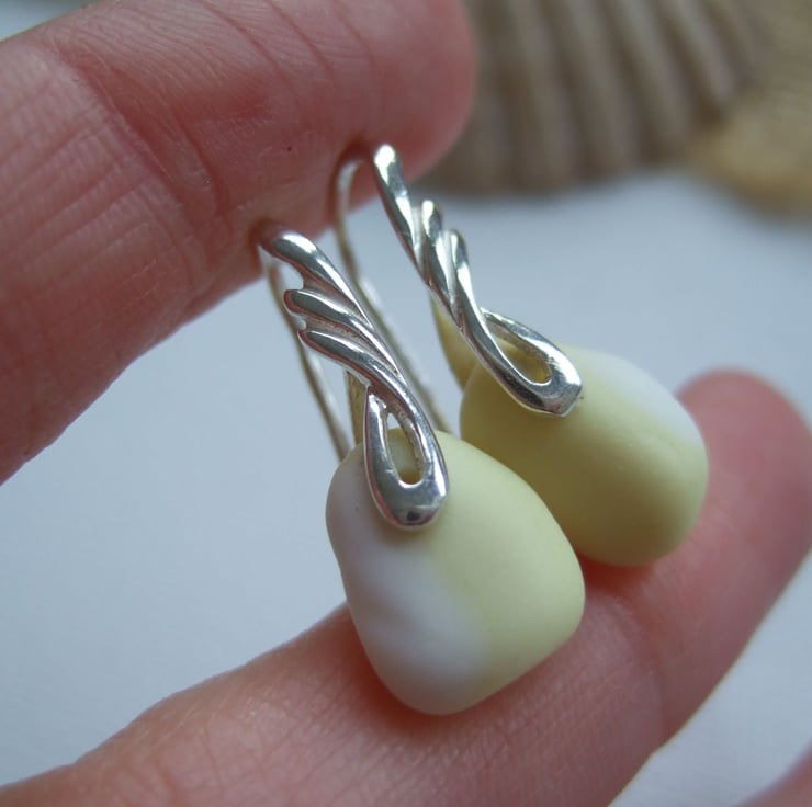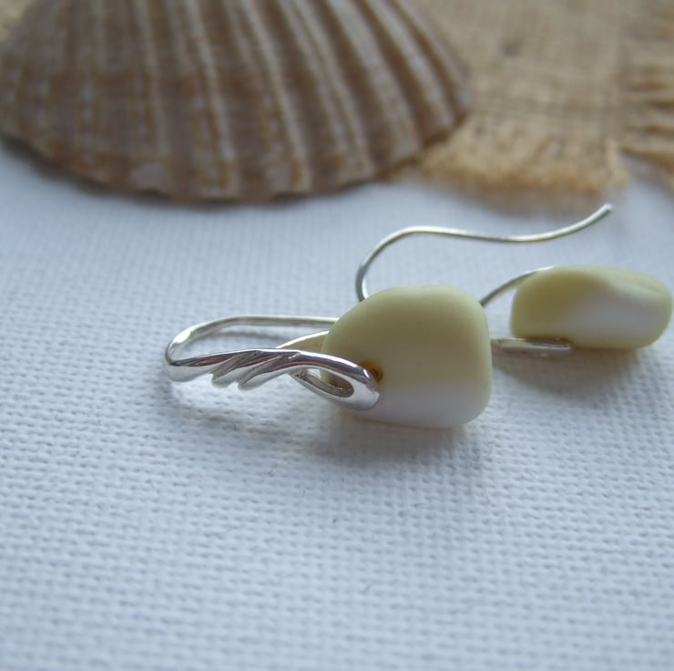 Lovely light yellow milk glass earrings with sea glass from world famous Seaham! These pieces are smooth, worn by the tides. Sea glass on sterling silver angel wings settings.