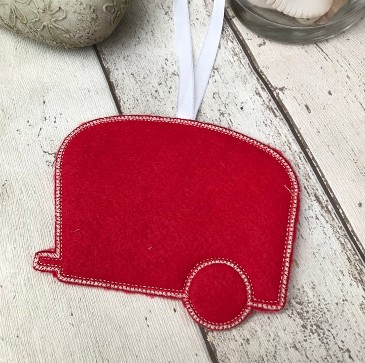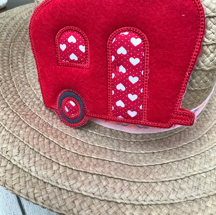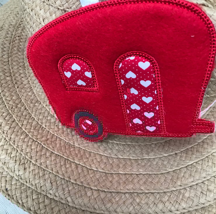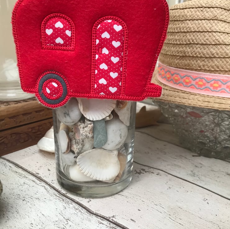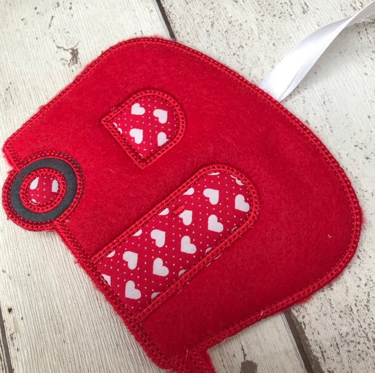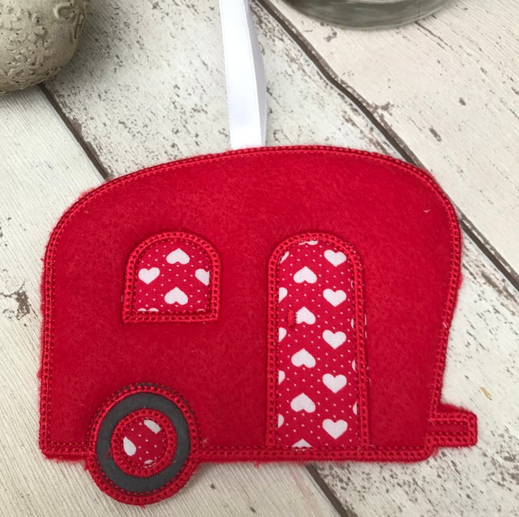 A lovely fun old style felt caravan hanging, a thoughtful Gift for a caravan lover. A cute decoration for your home or your home on 2 wheels. Made with red felt and heart design fabric. Machine embroidered.
