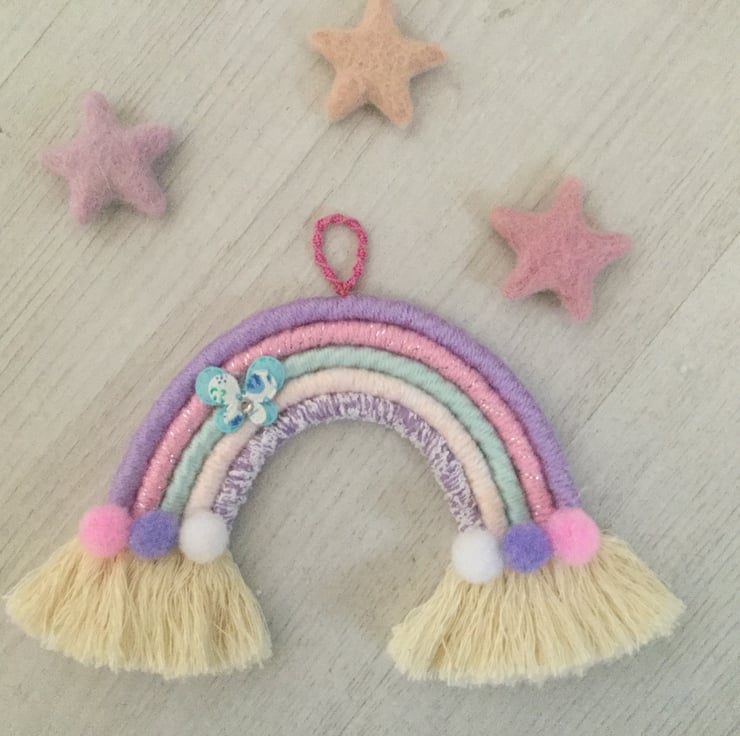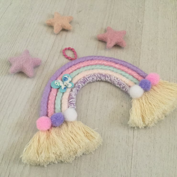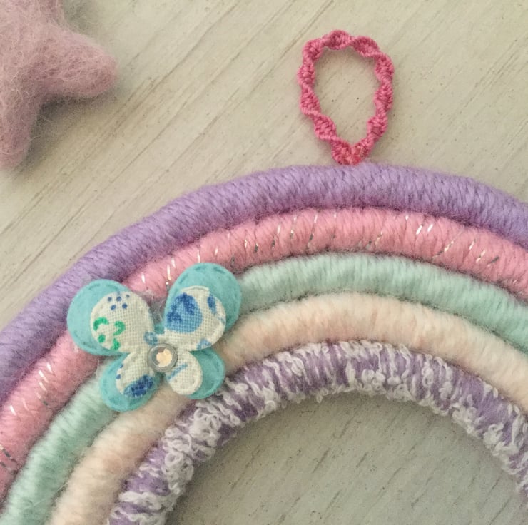Beautiful unique hand wrapped macrame rainbow wall hanging made using a variety of textures.