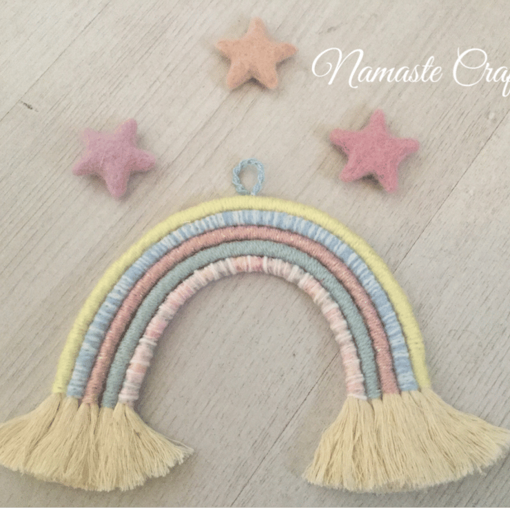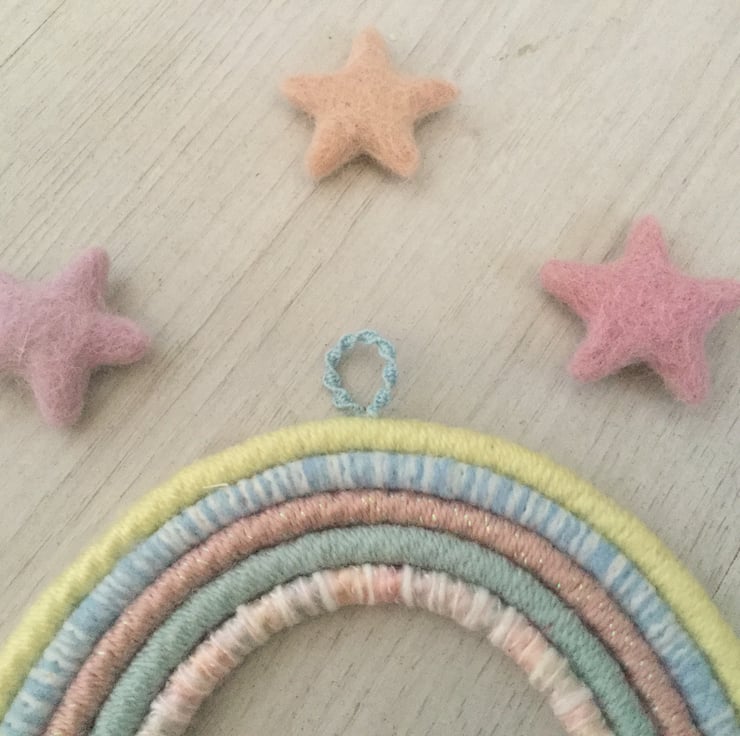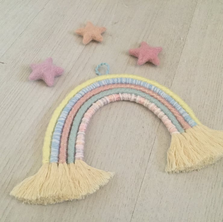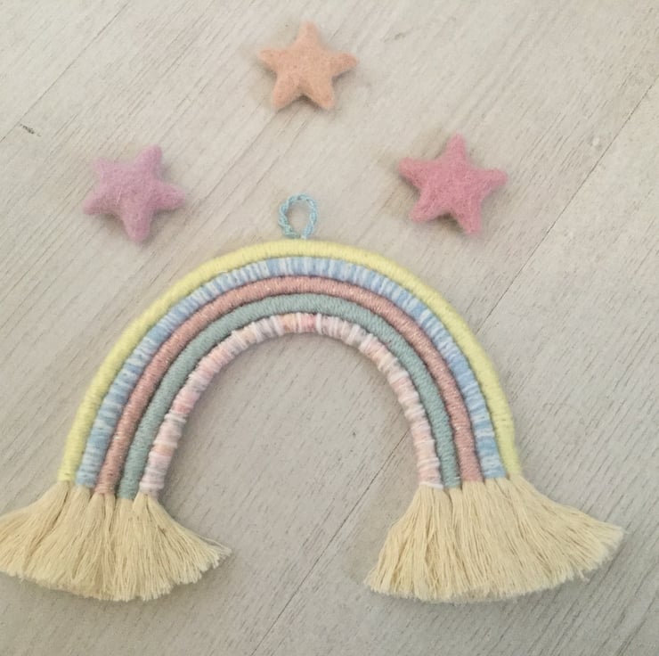 Beautiful unique hand wrapped macrame rainbow wall hanging made using a variety of textures.