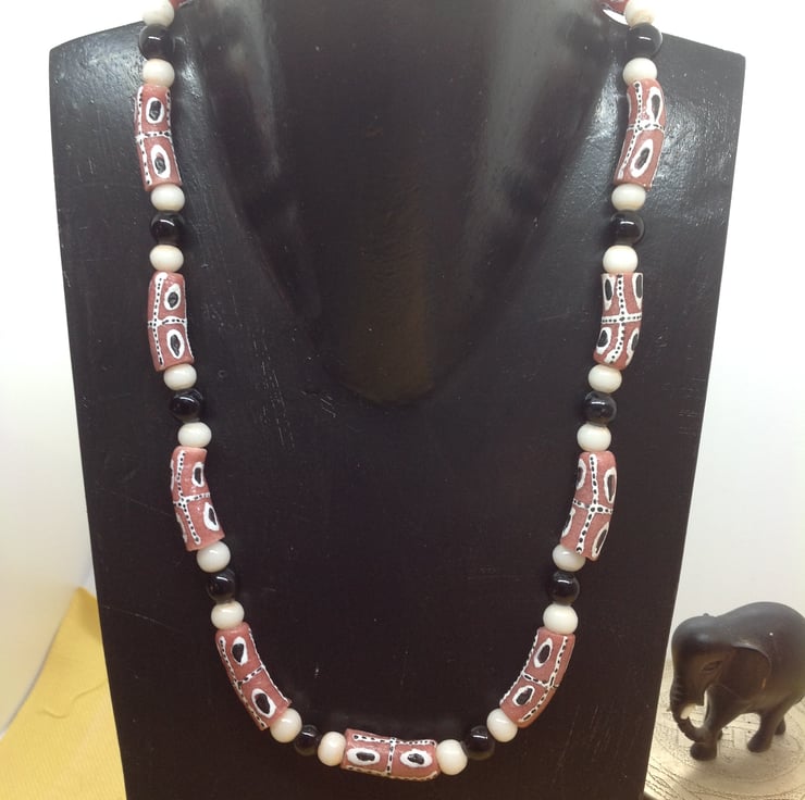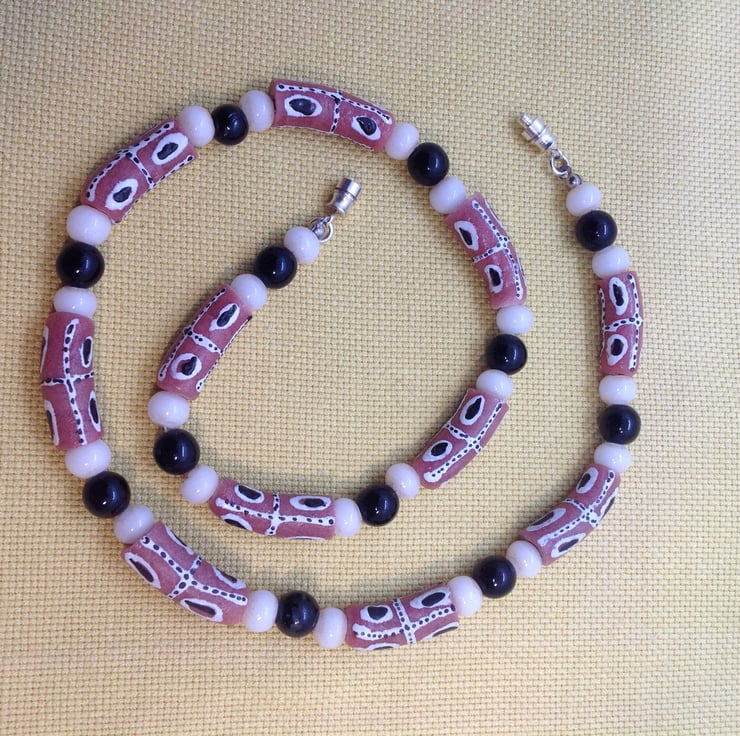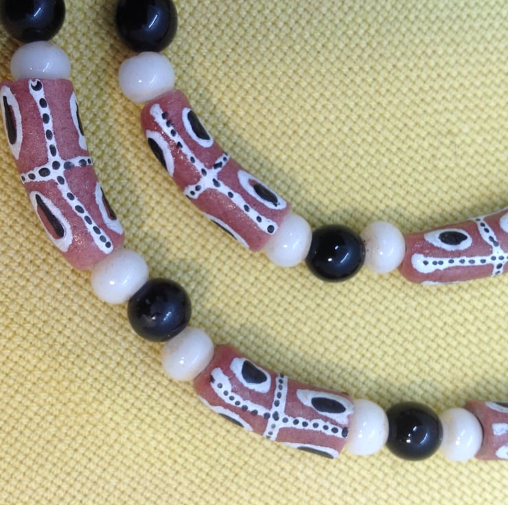 These salmon pink or terracotta glass beads were made in the Krobo region of Ghana, famous for its bead making for hundreds of years. They have been made with recycled glass. I have threaded them with black and white glass beads from Europe.