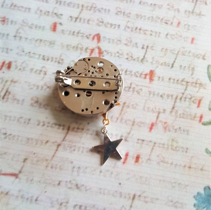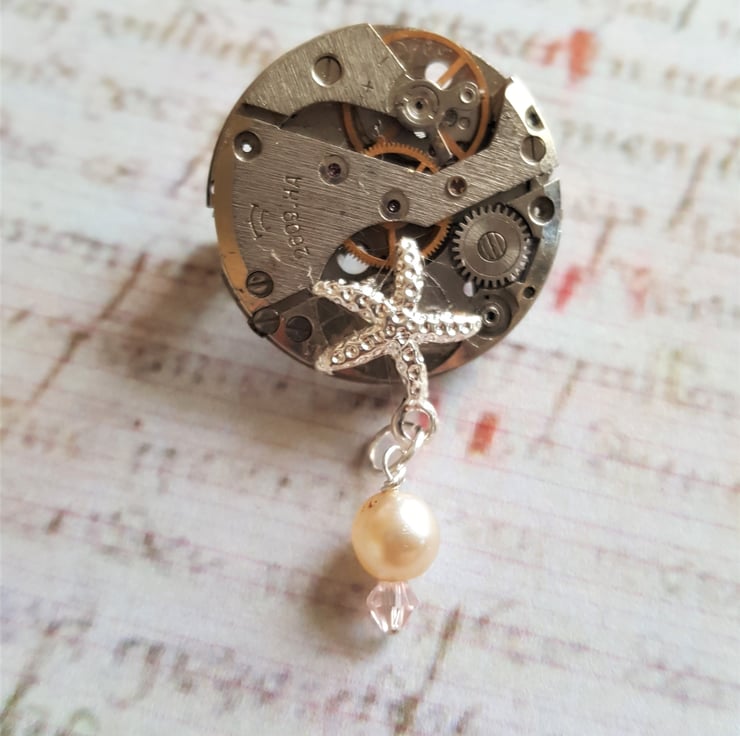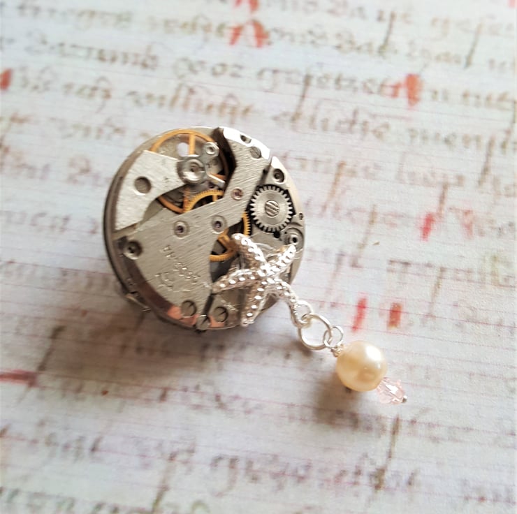 I created this OOAK Steampunk brooch from a rescued vintage gentleman's watch movement to which I added a sterling silver starfish charm with realistic detail and suspended from that a small genuine cream cultured pearl with sterling silver findings. The movement is so decorative with the components on show and the wheels still go round.