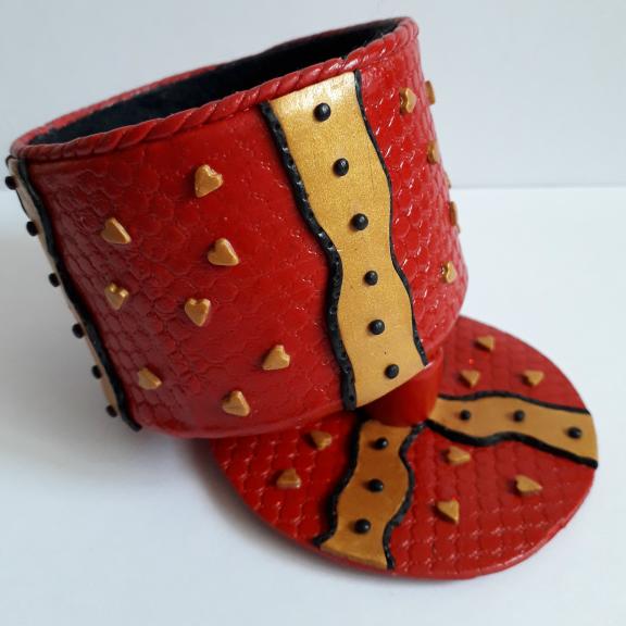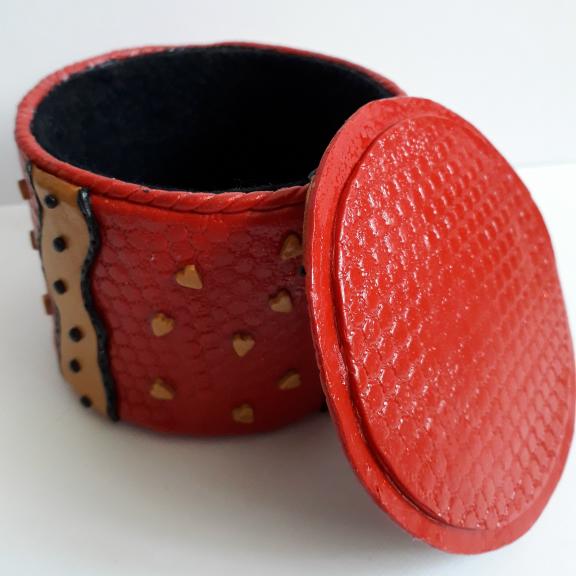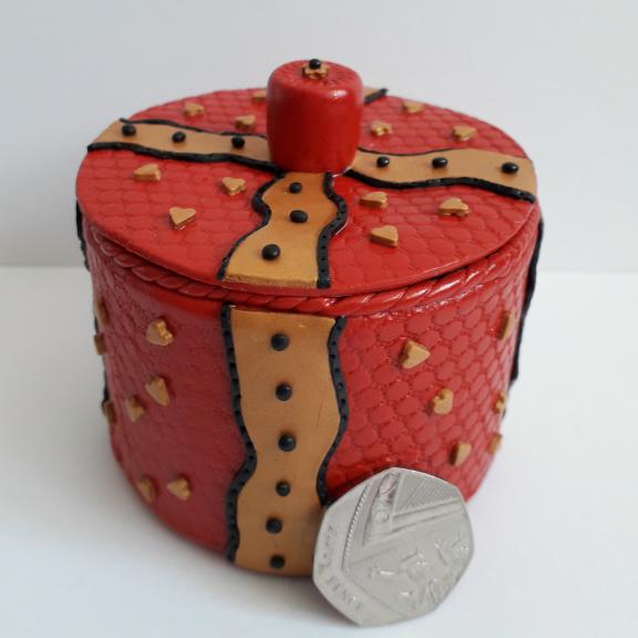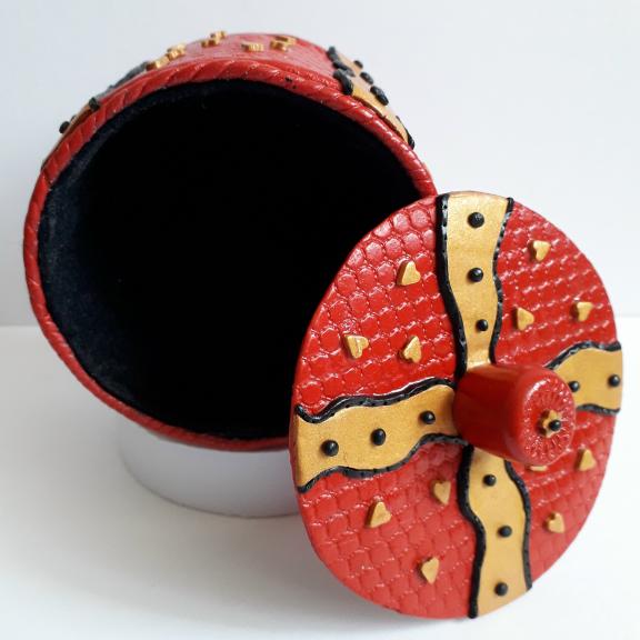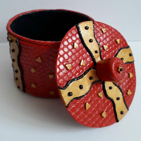 A glittery red trinket box covered in little gold hearts, it has gold panels with black dots and black edges, the lid has a matching pattern. The red clay has been textured with a circular quilted effect pattern, inside is lined with black felt.