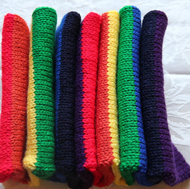 Knitted with two sets of the seven rainbow colours, at 48 inches long and 6.5 inches wide, it is long enough to wind around your neck twice.