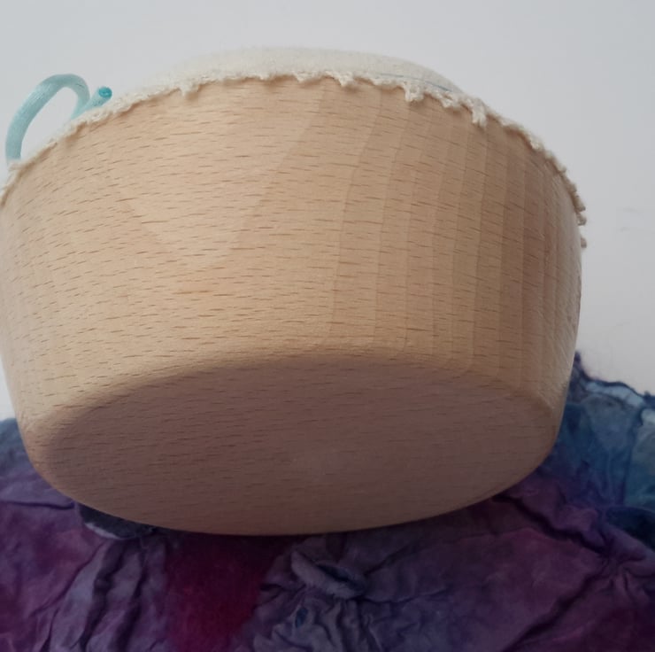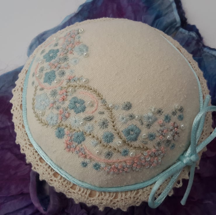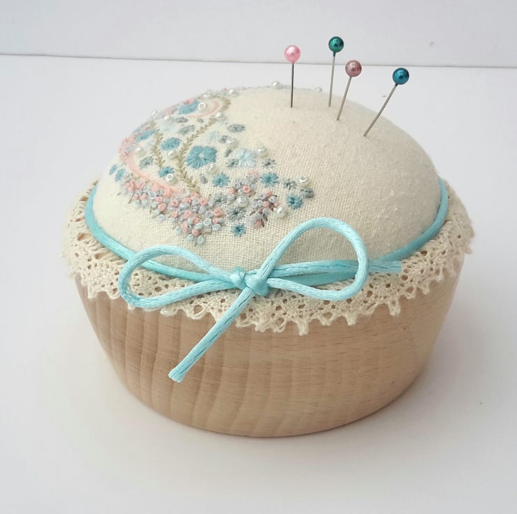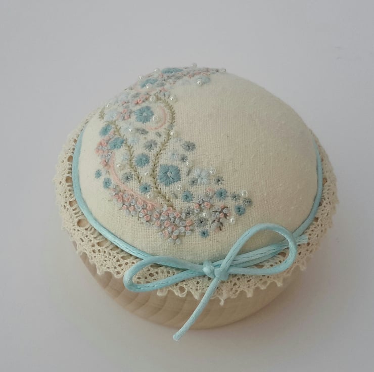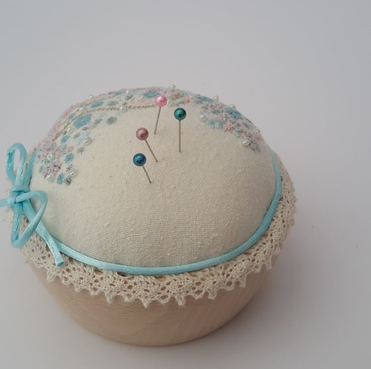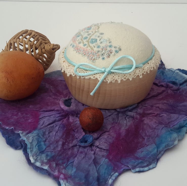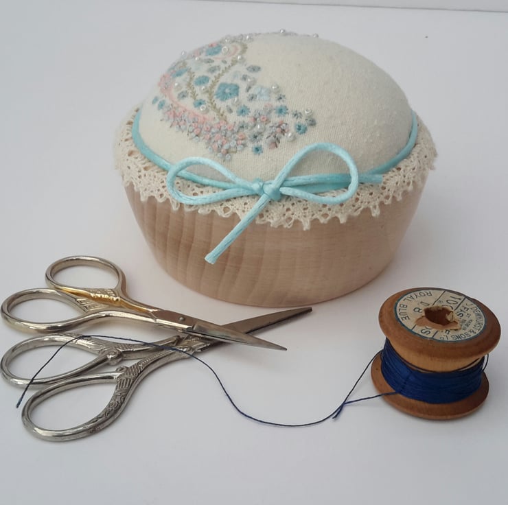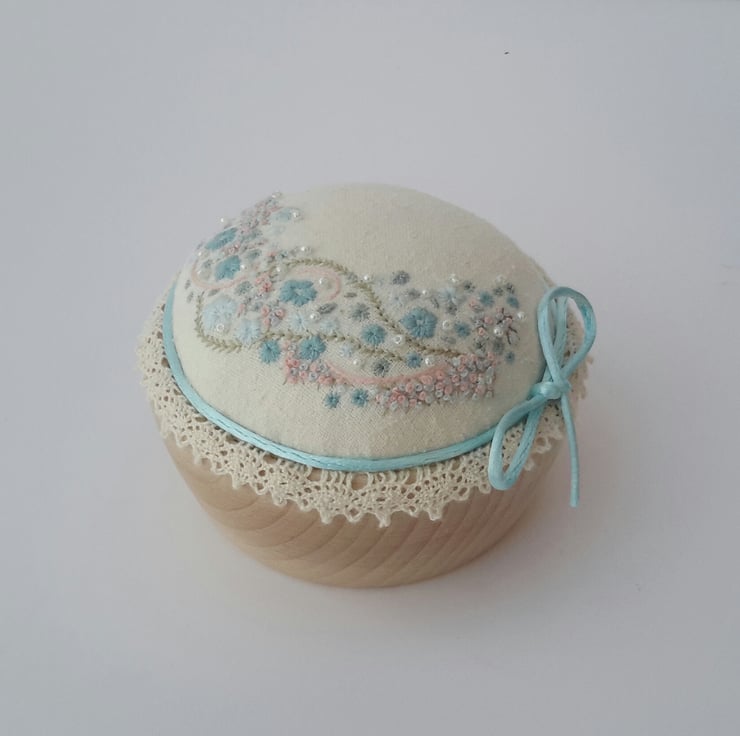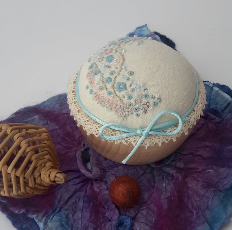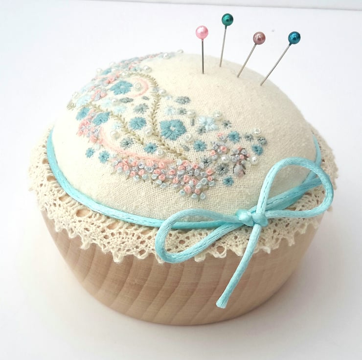 This listing is for a beautiful hand embroidered pincushion, designed and created by myself in a wooden bowl.