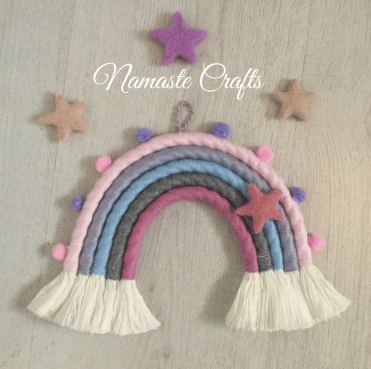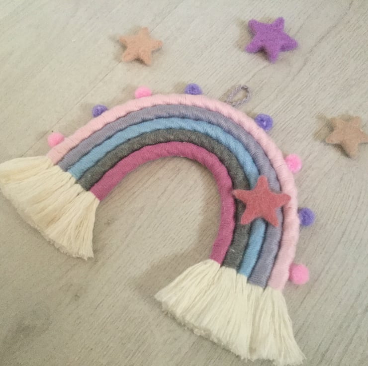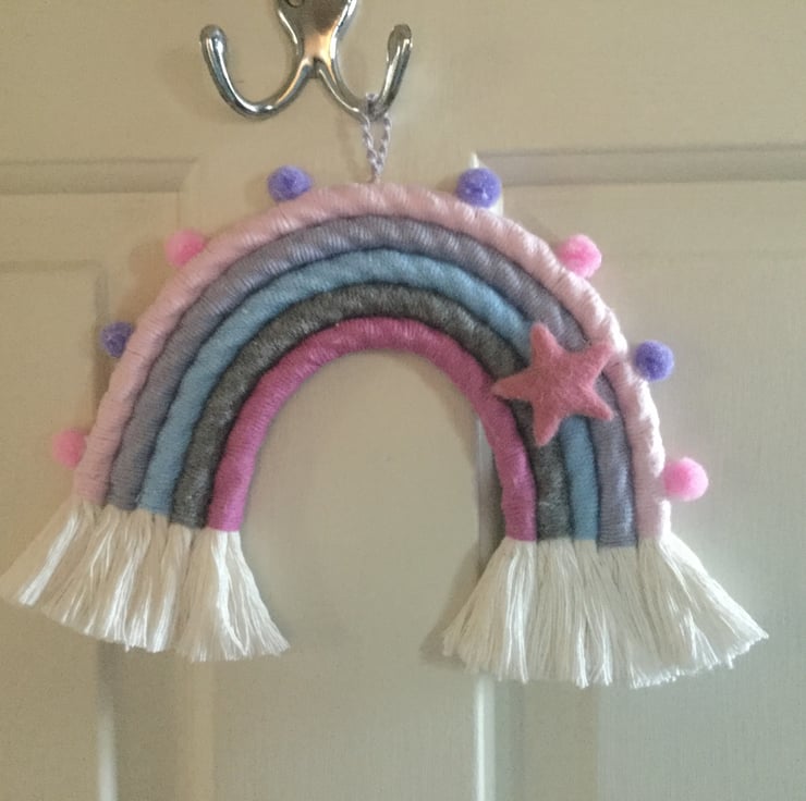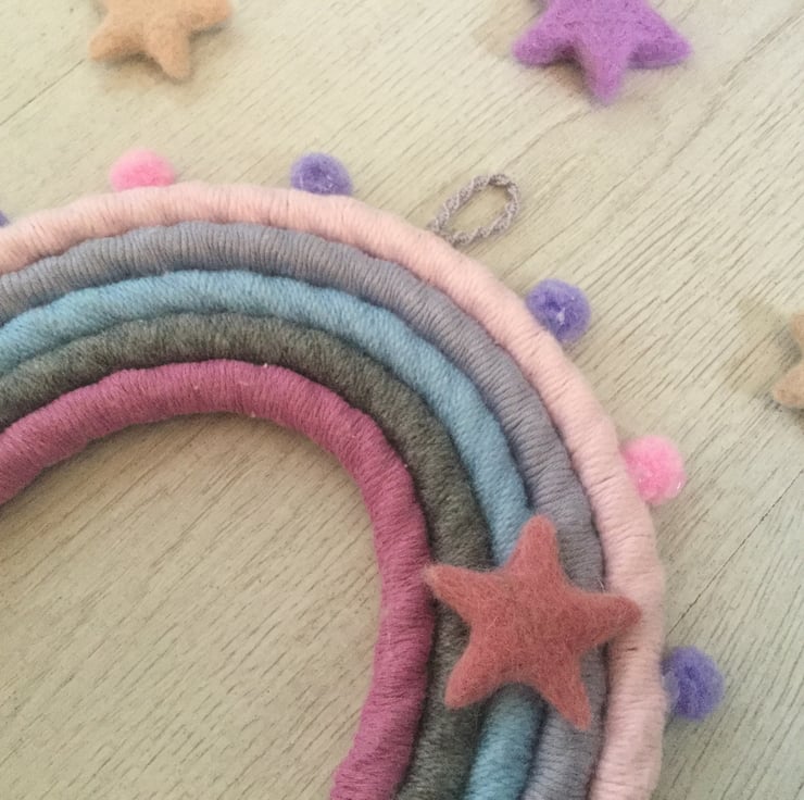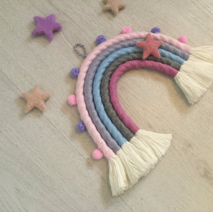 Beautiful unique hand wrapped macrame rainbow wall hanging made using a variety of textures.