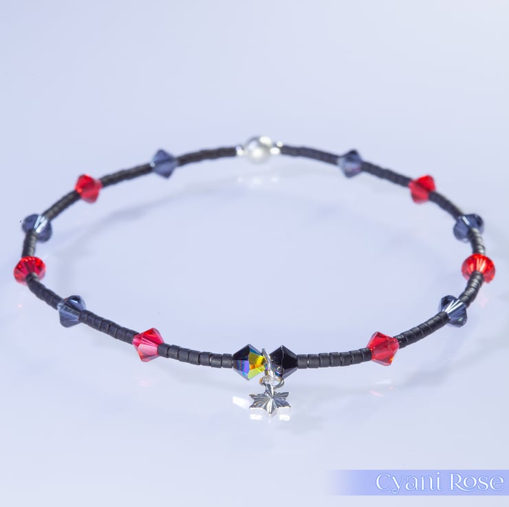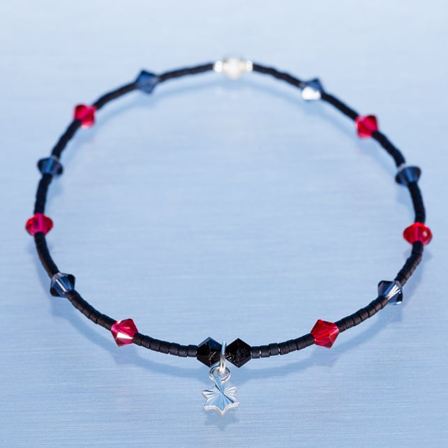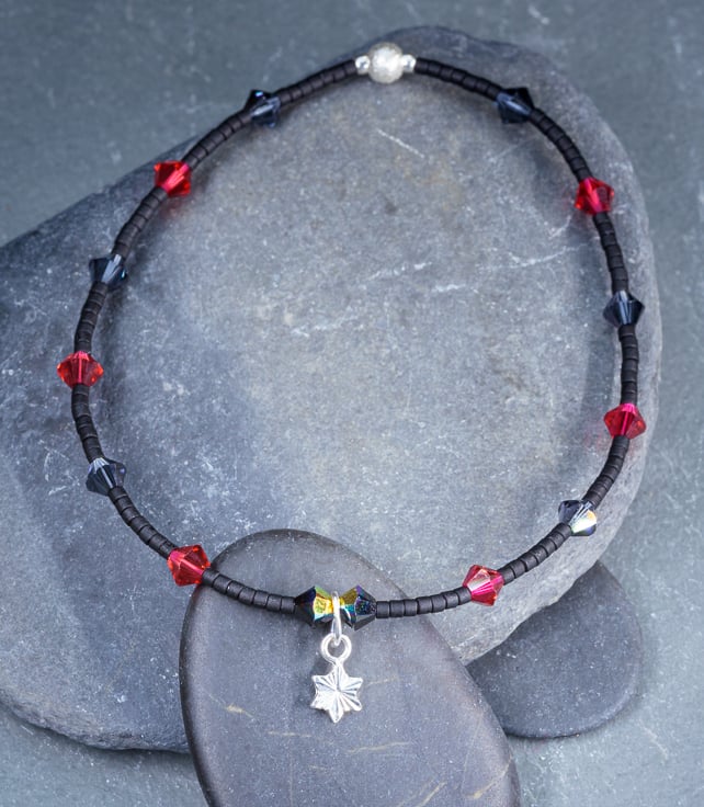 Dainty single bracelet made from black Miyuki delica beads, sterling silver beads and charm.