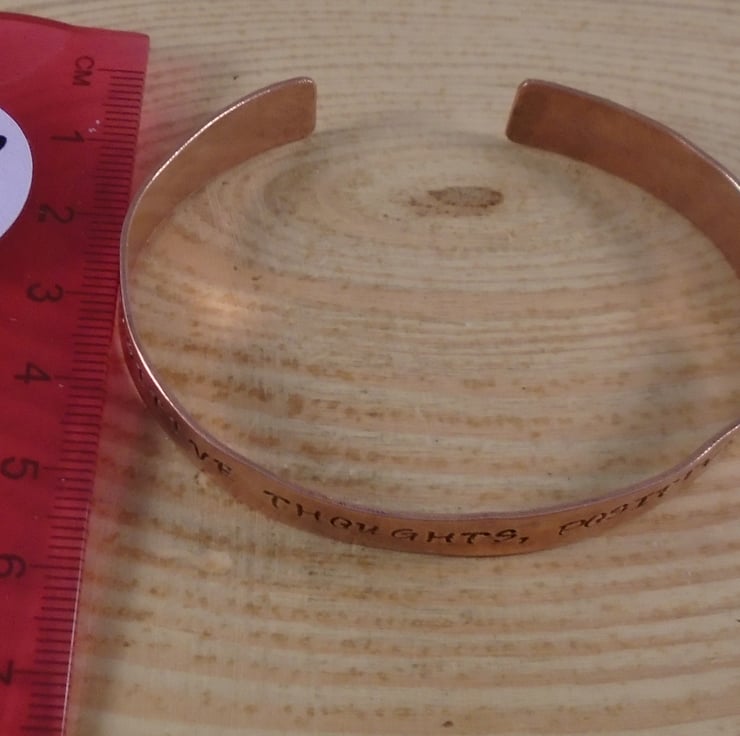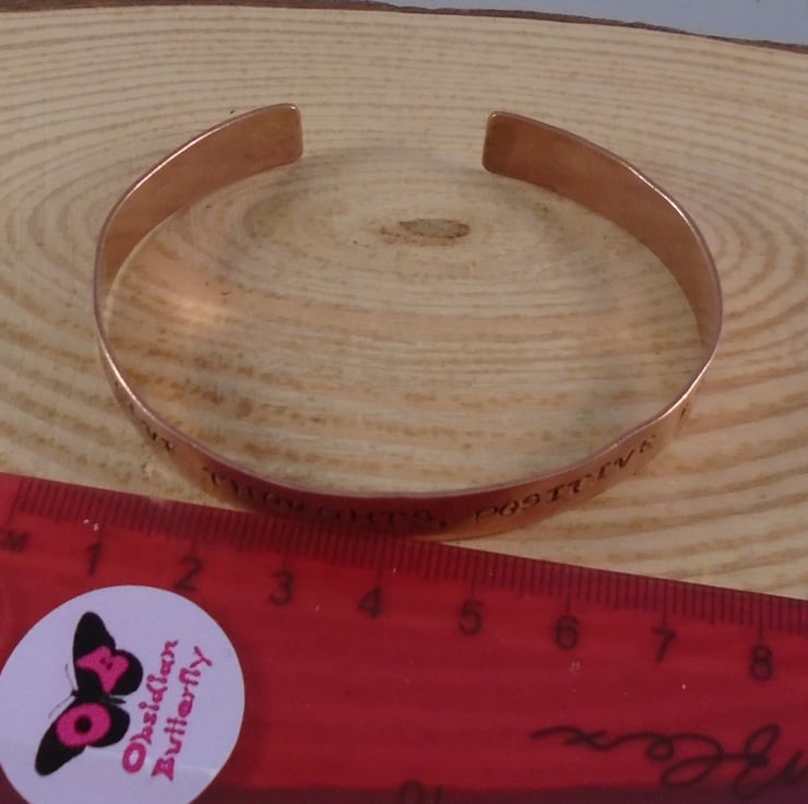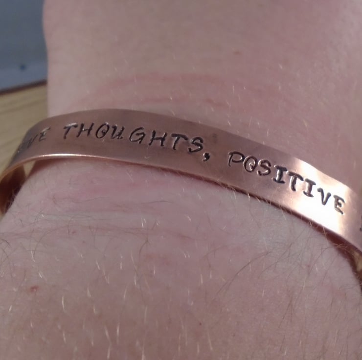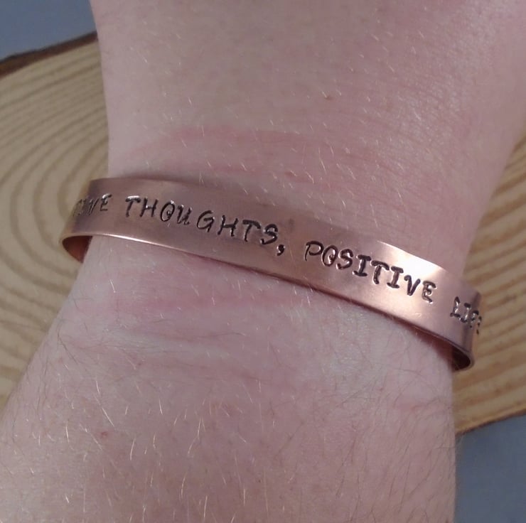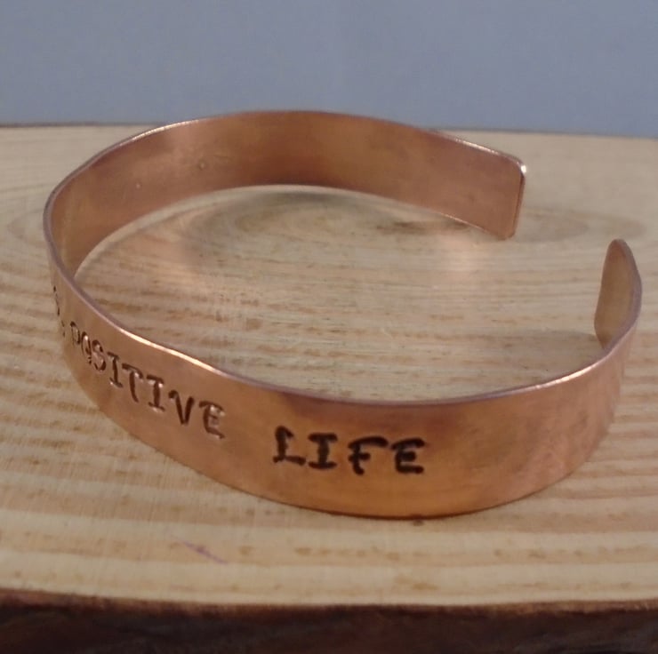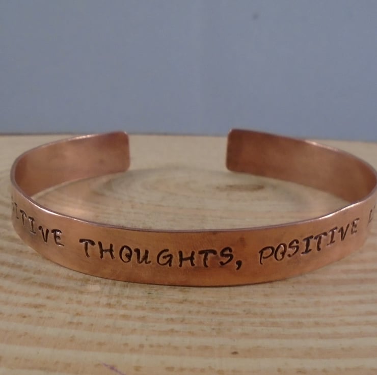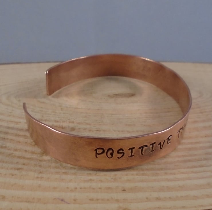 An inspirational, yet simple bangle, hand made from copper. A strip of copper has been hand cut and stamped with the words 'Positive Thoughts, Positive Life'. It has then been bent around a mandrel to form the bangle, and then oxidised to blacken the stamped wording.