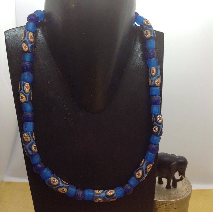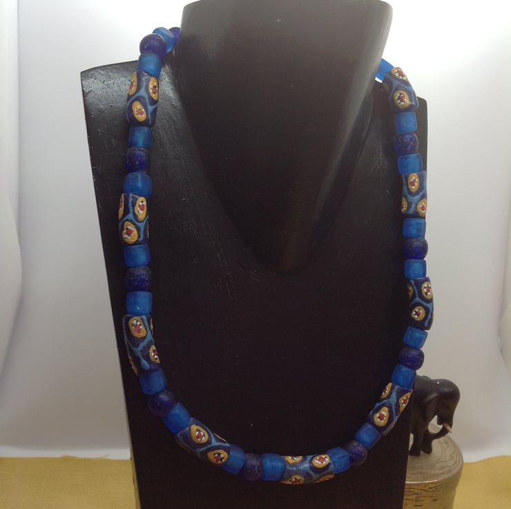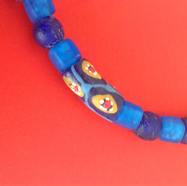 Beads: The large beads come from the Krobo region of Ghana - famous for its bead-making for hundreds of years. The glass is often recycled and a pattern has been painted on before a second firing.