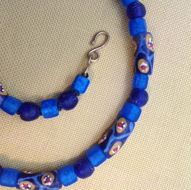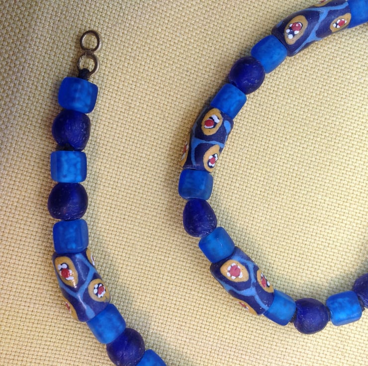 The blue beads also come from West Africa, while the lighter blue cube beads are from India.