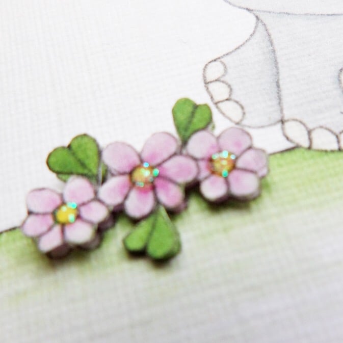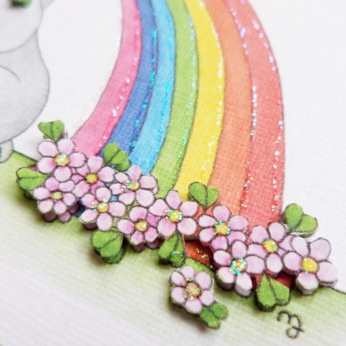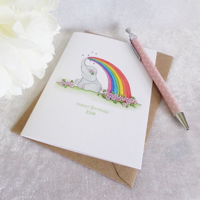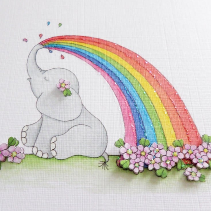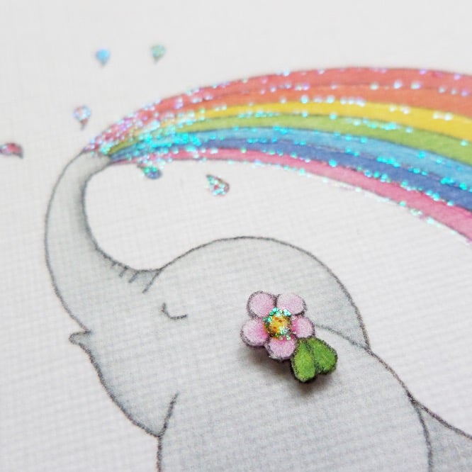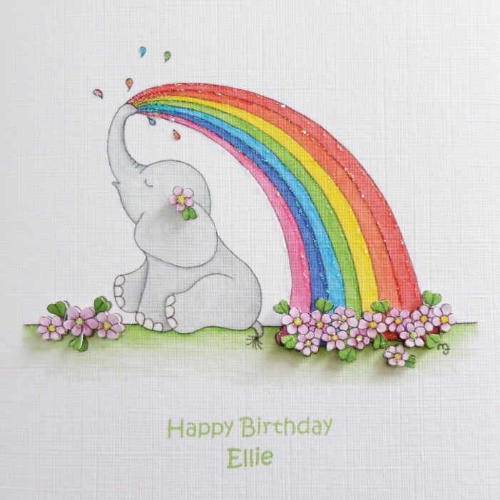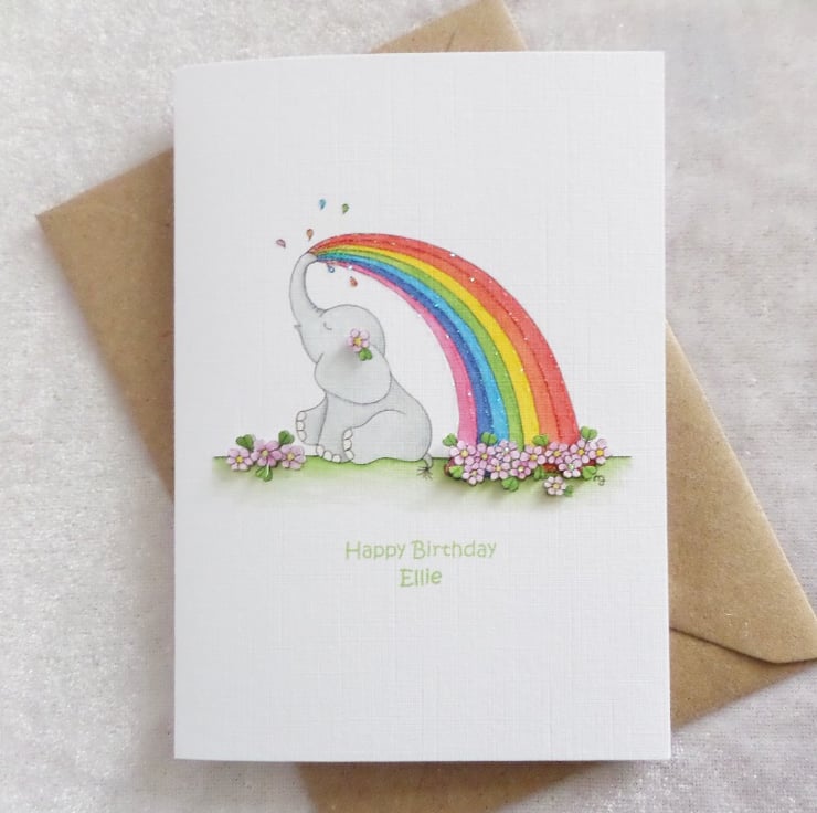 This cute personalised Rainbow Ellie card has been designed using my own original watercolour illustration. The card has been printed out onto good quality linen embossed card. The little decoupaged flowers have been cut out by hand and finished off with a little glitter detail. I have also added lots of lovely glitter to the rainbow.
