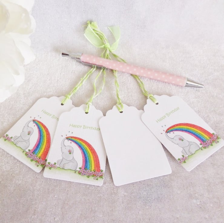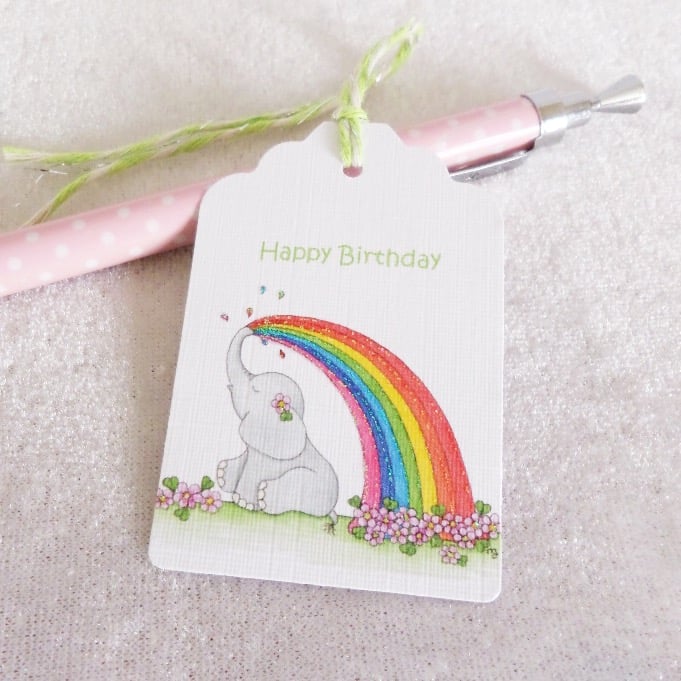 Each tag has been printed out onto good quality white linen embossed card and has a lime green coloured twine attached. I have also added a little glitter detail to the rainbow and flowers. Each tag is blank on the reverse for you to write your own message.
