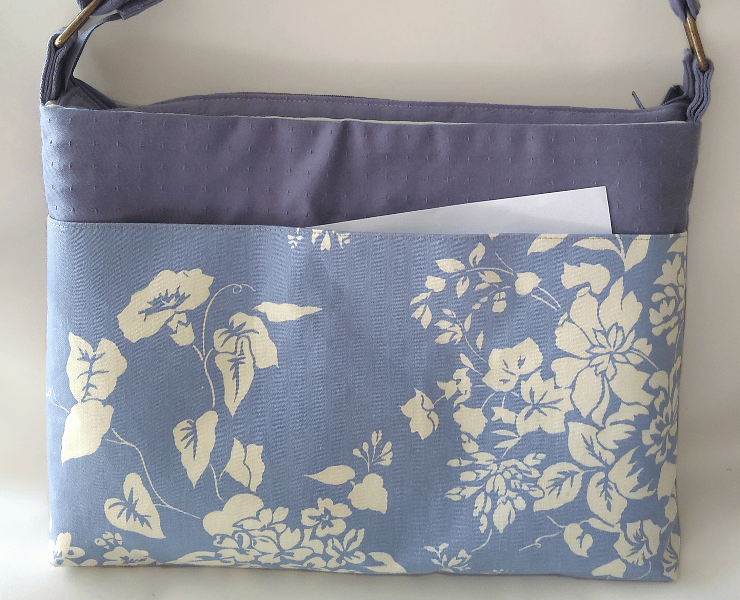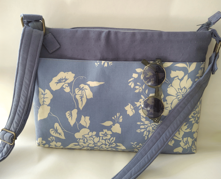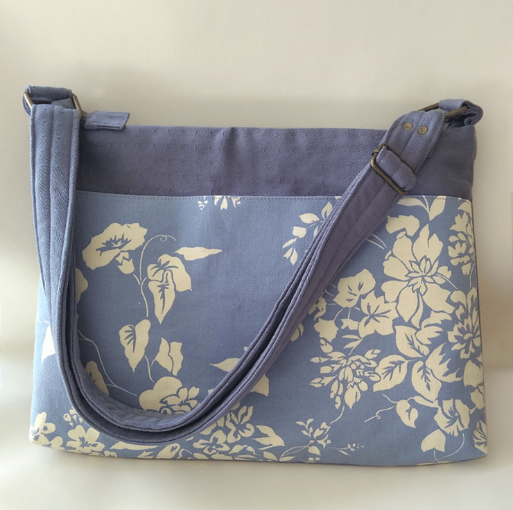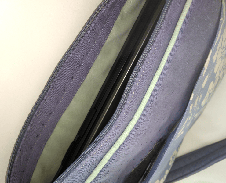 This listing is for a padded crossbody laptop bag with an adjustable strap. The main fabric is a soft shade of blue with textured dots. The feature fabric has an elegant lilac background colour adorned with a cream floral design (only on the front). The patterned fabric is a slip pocket, the width of the bag, secured with Velcro.