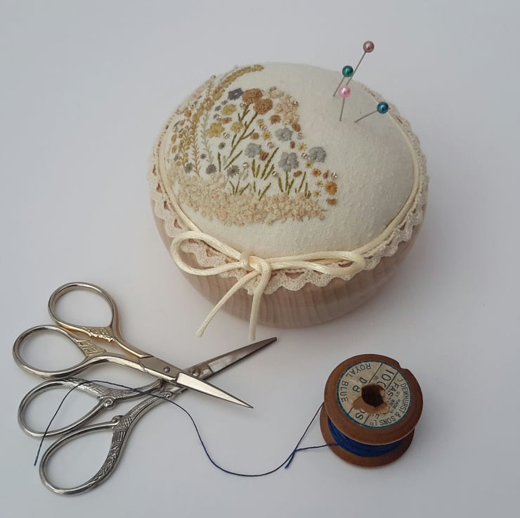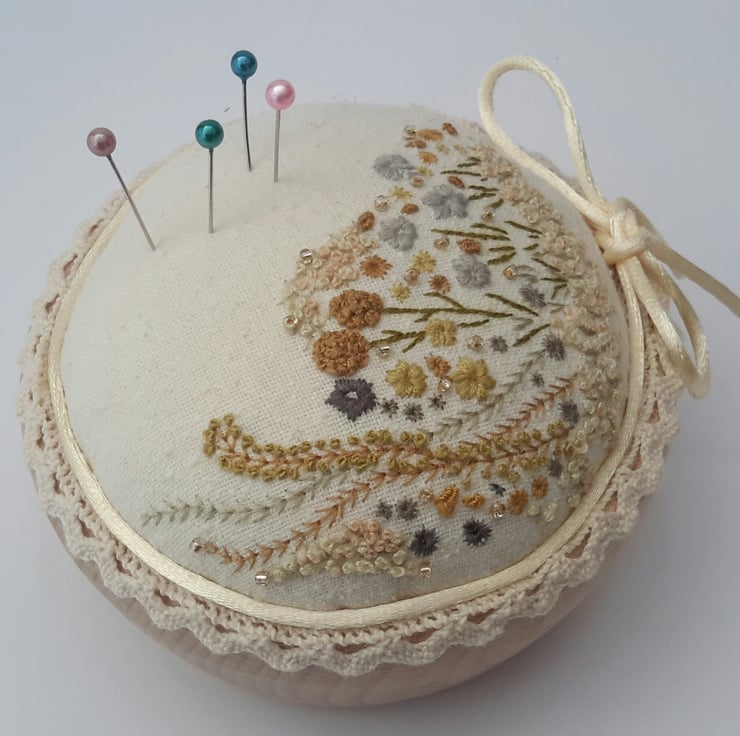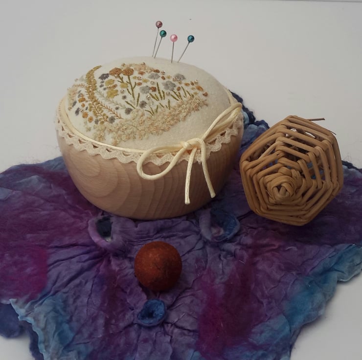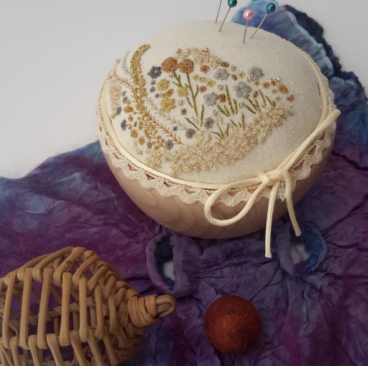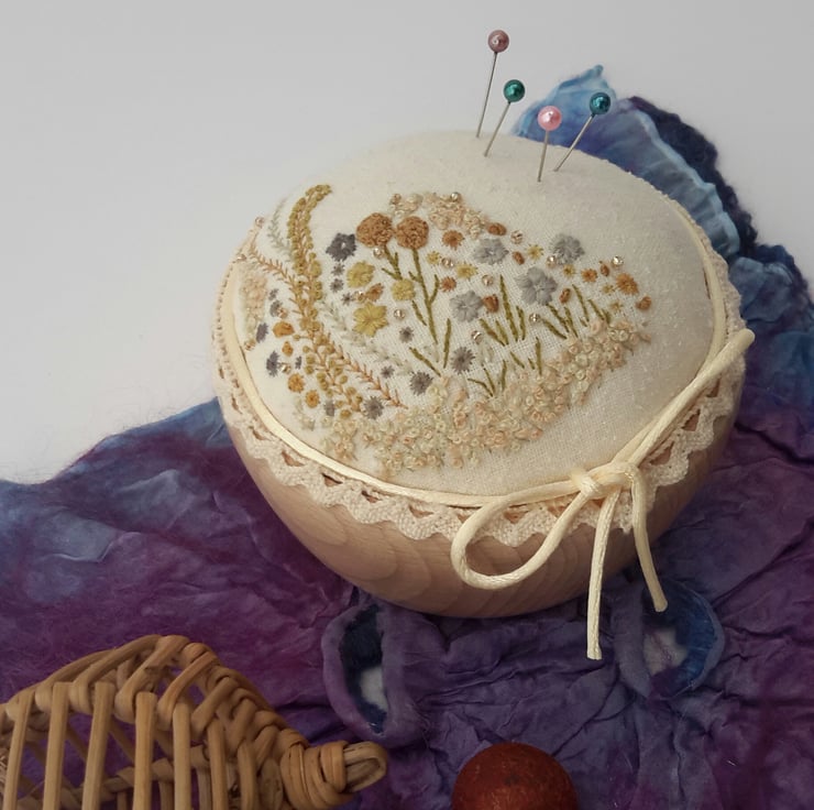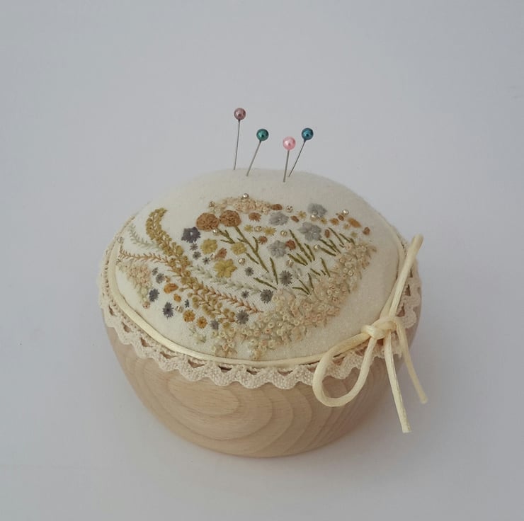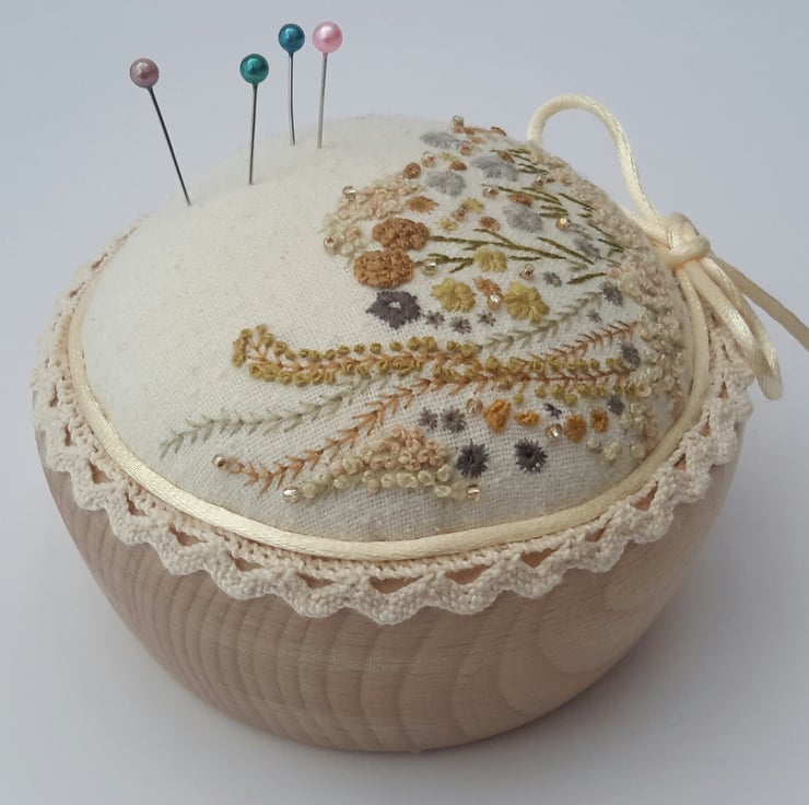 This listing is for a unique hand embroidered pin cushion in a wooden bowl, designed and created by Bearlescent.