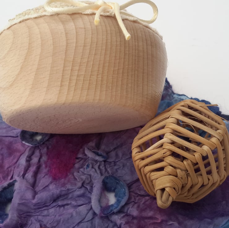 Hand sewn onto a piece of natural coloured silk noil fabric, backed with a piece of natural cotton and fitted over a cotton form, stuffed very firmly with super polyester filling then fitted into a tapered wooden bowl.